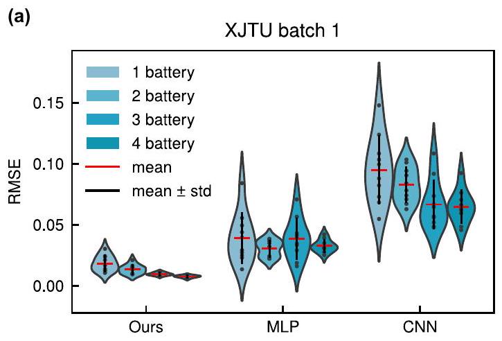 Fig. 5 | An illustration of test root mean square error (RMSE) distributions for three models (the proposed PINN (Ours), multi-layer perceptron (MLP), and convolutional neural network (CNN)) on two datasets. Each error bar contains 10 points ( 10 experiment) and is marked with mean and standard deviation lines. The ” 1 battery” in the legend means that we only use the data of 1 battery to train the