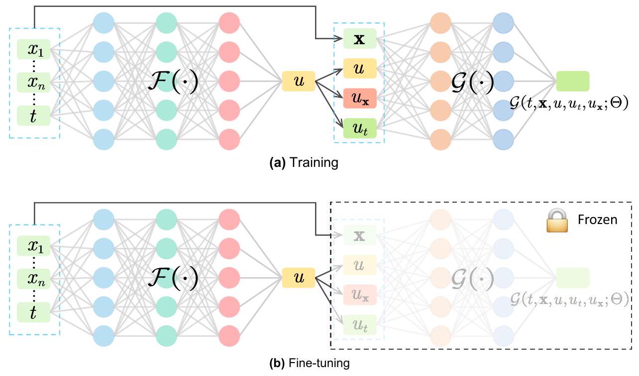 We believe that the degradation dynamics are independent of charge/discharge protocols and datasets, while the solution is related to them. After learning from massive data, should contain general information that can reflect the nature of battery degradation, which is useful for cross-scenario SOH estimation. Therefore, we only fine-tune the weights of the solution and make the weights of dynamics frozen, as shown in Fig. 6b.