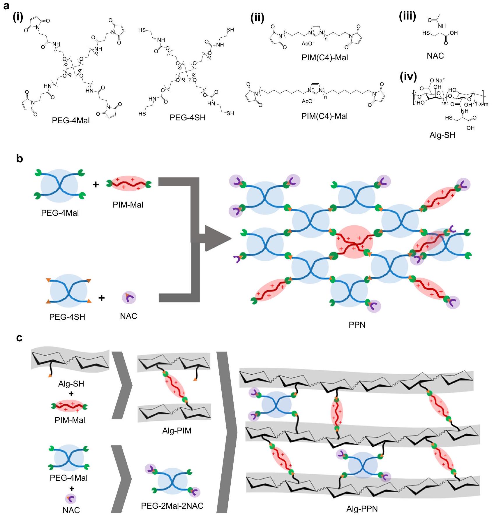 تم تعزيز هيدروجيل مشتق من بولي إيثيلين جلايكول (PEG) بخصائص مضادة للبكتيريا ومضادة للأكسدة من خلال إضافة سلسلة رئيسية كاتيونية من بوليميدازوليوم-ماليميد (PIM-Mal) ومكون ثانٍ من-أسيتيل سيستين (NAC) (الشكل 1a). تم ربط كلا الجزيئين (مشتق PIM-Mal و NAC) بشكل تساهمي في شبكة الهيدروجيل من خلال كيمياء الثيول-ماليميد. تم تحضير PIM-Mal مسبقًا عبر كيمياء بولي-رادزيشيفسكي السهلة لصنع PIM المنتهي بالديامين، تلاها تعديل النهاية مع أنهدريد الماليك. (الشكل التكميلي 1). تم تصنيع الهيدروجيل في شكلين، وهما شكل الفيلم وشكل الألياف. الشكل الأول، وهو شكل هيدروجيل الفيلم المسمى PPN (الشكل 1ب) الذي تم الحصول عليه من تداخل 4 ذراعات من PEG-thiol (PEG-4SH) مع 4 ذراعات من PEG-maleimide (PEG-4Mal)، مع إضافة PIM-Mal و NAC، مناسب للجروح المسطحة نسبياً. الشكل الثاني الذي يستخدم الألجينات (المسمى Alg-PPN (الشكل 1ج)) تم تجميعه من خلال تداخل (i) PEG-2Mal-2NAC المصنوع من PEG-4Mal الذي تم تفاعله مسبقاً مع NAC بحيث تم ربط ذراعين بـ NAC (الشكل التكميلي 2)، و (ii) Alg-SH-PIM الذي تم تفاعله مسبقاً من الألجينات الوظيفية بالثيول (Alg-SH) مع PIM-Mal؛ هذا الشكل مناسب للجروح العميقة.
