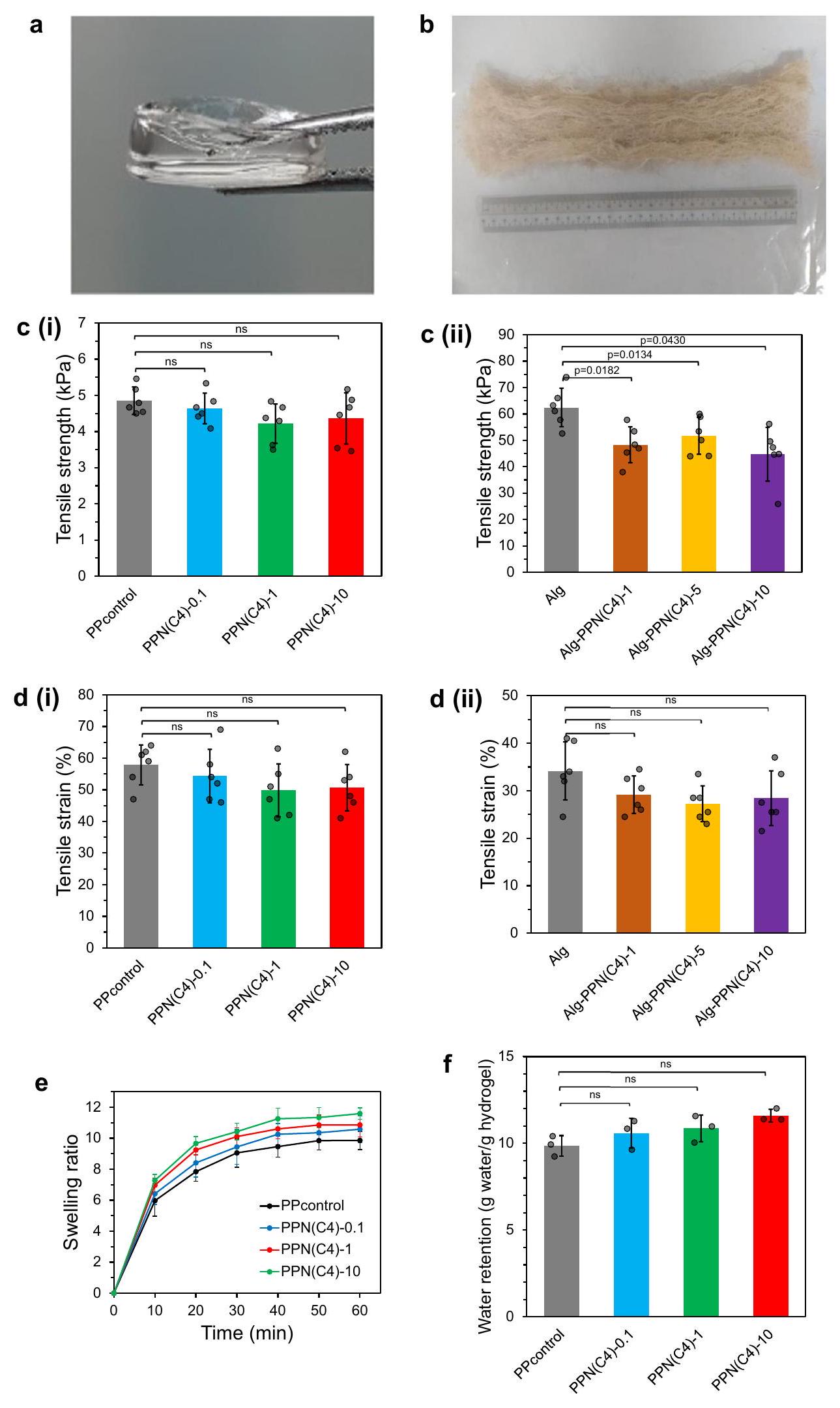 Briefly, the 4 -arm PEG-4Mal was pre-modified with 2 equivalents of NAC to convert, on average, 2 PEG arms per chain to NAC terminals to produce PEG-2Mal-2NAC (Fig. 1c, Supplementary Fig. 2a). Thiolmodified alginate (Alg-SH) was pre-reacted with PIM(Cn)-Mal to produce Alg-SH-PIM(Cn) (Fig. 1c, Supplementary Fig. 2b). Some thiol groups remained unreacted in Alg-SH-PIM(Cn) for subsequent click reactions, and were quantified (Supplementary Fig. 16). The Alg-SH-PIM and PEG-2Mal-2NAC were further reacted via the thiol-maleimide reaction to form the Alg-PPN solution (Fig. 1c), which was then coagulated in a bath to obtain Alg-PPN fibers. An alginate fiber control (labeled as Alg) was produced by extruding Alg-SH solution into a bath (Table 2). The as-prepared fibers were washed thoroughly in DI water with sonication and dehydrated in ethanol. The hydrogel fibers showed a range of tensile strengths of and tensile strains (elongation) of 27-34% (Fig. 2c(ii), d(ii)). The amount of leachable PIM, NAC, and PEG components after washing was found to be less than , and of the initial PIM, NAC, and PEG components respectively (Supplementary Figs. 17-18, Supplementary Table 3-5). We also used a commercial alginate fiber (labeled as Alg-Com) and commercial silvercontaining alginate fiber (Alg-Ag) as control samples.