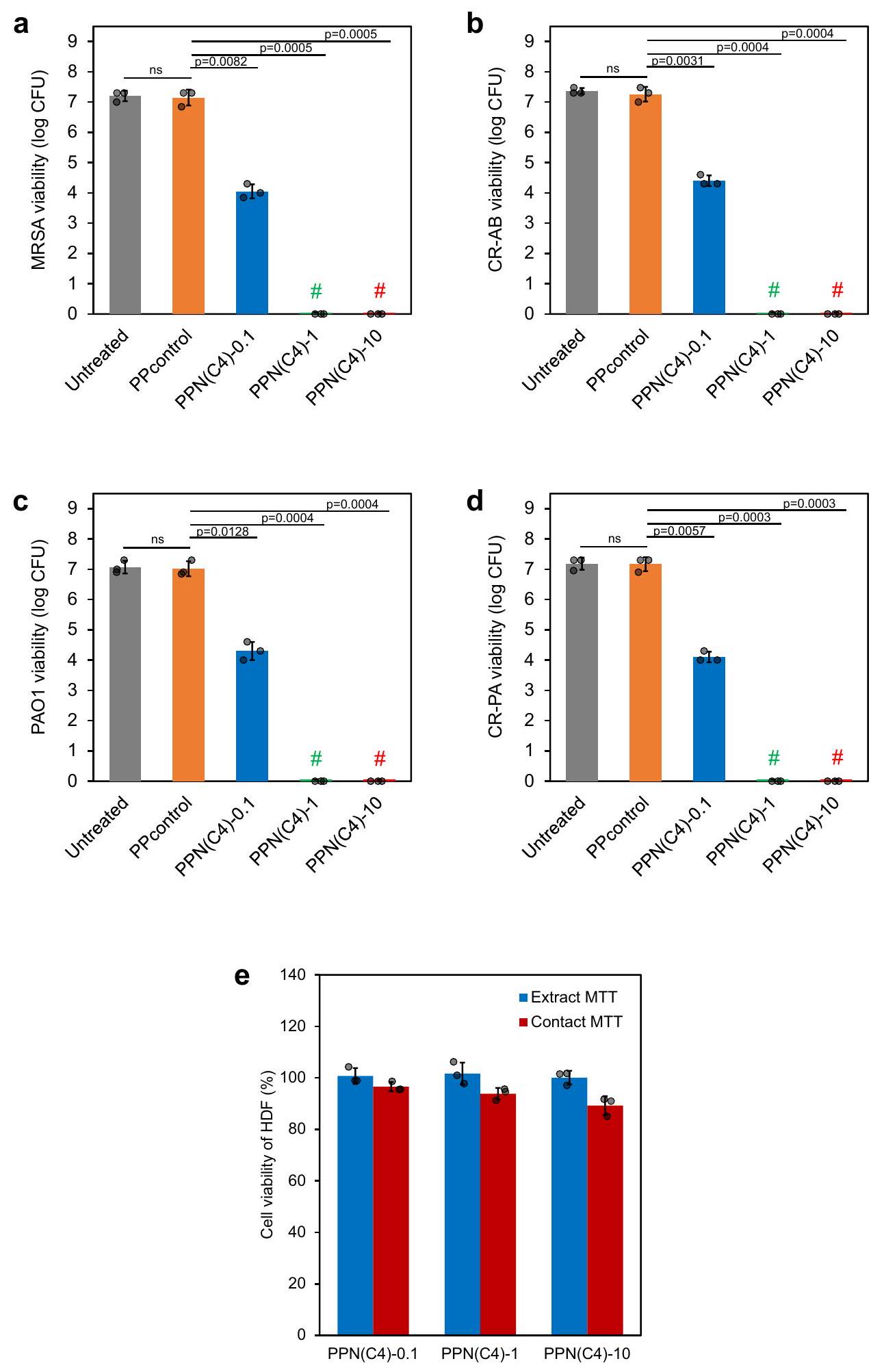 تم قياس فعالية القتل عند الاتصال في المختبر لهلامات PPN(C4) لمجموعة متنوعة من سلالات البكتيريا المقاومة المتعددة للعقاقير (MDR) سالبة وموجبة الجرام التي لها صلة سريرية بالجروح المصابة.، تحديداً MRSA USA300 وCR-AB وPAO1 وCR-PA، وهي مسببات أمراض تثير قلقاً كبيراً على مستوى العالم. لقد قضت PPN(C4)-1 وPPN(C4)-10 تمامًا على سلالات البكتيريا المختلفة المحملة على أقراص الهيدروجيل في ساعة واحدة (الشكل 3أ، د). لم تقض PPN(C4)-0.1 هيدروجيل تمامًا على جميع البكتيريا (الشكل 3أ، د)، ربما بسبب تركيزها المنخفض من مكون PIM-Mal المضاد للبكتيريا النشط حيويًا. لم يظهر PPcontrol خصائص قاتلة للبكتيريا. كما أن الهيدروجيل ومستخلصاته تظهر سمية منخفضة لخلايا الأدمة البشرية (HDFs)، كما تم تقييمه من خلال اختبار 3-(4،5-ثنائي ميثيل ثيازول-2-يل)-2،5-ثنائي فينيل تيترازوليوم بروميد (MTT). كانت نسبة بقاء الخلايا 100% لخلايا HDF المعرضة لجميع مستخلصات الهيدروجيل (الشكل 3هـ). بالنسبة لاختبار الاتصال بالهيدروجيل، كانت نسبة بقاء خلايا HDF و لـ PPN(C4)-0.1 و PPN(C4)-1 و PPN(C4)-10، على التوالي (الشكل 3e)، مما يشير إلى سمية حادة منخفضة وتوافق حيوي جيد لهذه الهلامات.