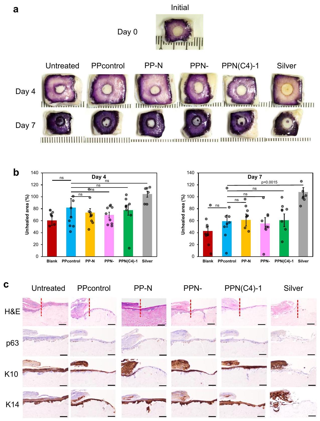 ظلت منخفضة باستمرار (الشكل 5ب). بالمقابل، أدت الضمادة الفضية و PPcontrol إلى عدد أقل بكثير من البكتيريا التي تم القضاء عليها (أقل من 1 لوغاريتم)، وأظهرت الجروح الضابطة غير المعالجة تقريبًا عدم وجود انخفاض في البكتيريا على مدى أسبوعين (الشكل 5ب). علاوة على ذلك، كانت الجروح المعالجة بهلام PPN(C4)-1 أصغر، مع أدلة قليلة على النخر، مقارنة بالجروح الضابطة غير المعالجة، و PPcontrol، والآفات المعالجة بالضمادة الفضية في جميع النقاط الزمنية (الشكل 5ج، د، النسخ البيولوجية موضحة في الشكل التكميلي 10). بشكل ملحوظ، أغلقت الجروح المعالجة بـ PPN(C4)-1 تمامًا في اليوم 12. بالمقابل، فشلت الجروح غير المعالجة و PPcontrol والضمادات الفضية في الإغلاق حتى بعد أسبوعين. كانت هناك علامات على وجود صديد ونخر ملحوظة على الجروح الضابطة غير المعالجة، مما يشير إلى تكوين الأغشية الحيوية والالتهاب المستمر طوال الدراسة (الشكل 5د، الشكل التكميلي 10أ). أظهرت الجروح الضابطة غير المعالجة علامات على التدهور وعرضت أدلة على إعادة العدوى (الشكل التكميلي 10أ).