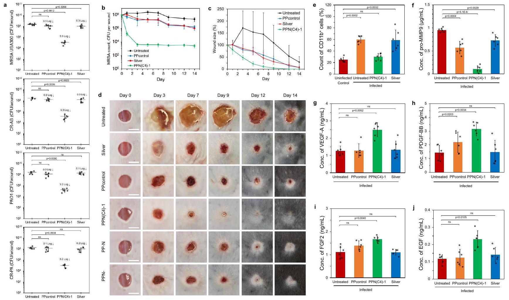 الجروح الضابطة غير المعالجة، والضمادة الفضية، و PPcontrol، والجروح المعالجة بهلام PPN(C4)-1 بين تغييرات الضمادة. مقياس الرسم . هـ-ي توصيف أنسجة الجروح. القياسات في الفئران المصابة بـ MRSA USA300 ( الفئران، اختبار ستودنت ذو طرفين ) في اليوم الثاني بعد العلاج: هـ نسبة خلايا CD11b في الجروح. نسبة الخلايا تتناسب طرديًا مع مدى الالتهاب في الجلد. تركيز البرو- MMP9 في الجروح. تركيزات عوامل شفاء الجروح (ج) VEGF-A، (ح) PDGF-BB، (ط) FGF-2 و (ي) EGF في الجروح. يتم تقديم البيانات كقيم متوسطة SD.