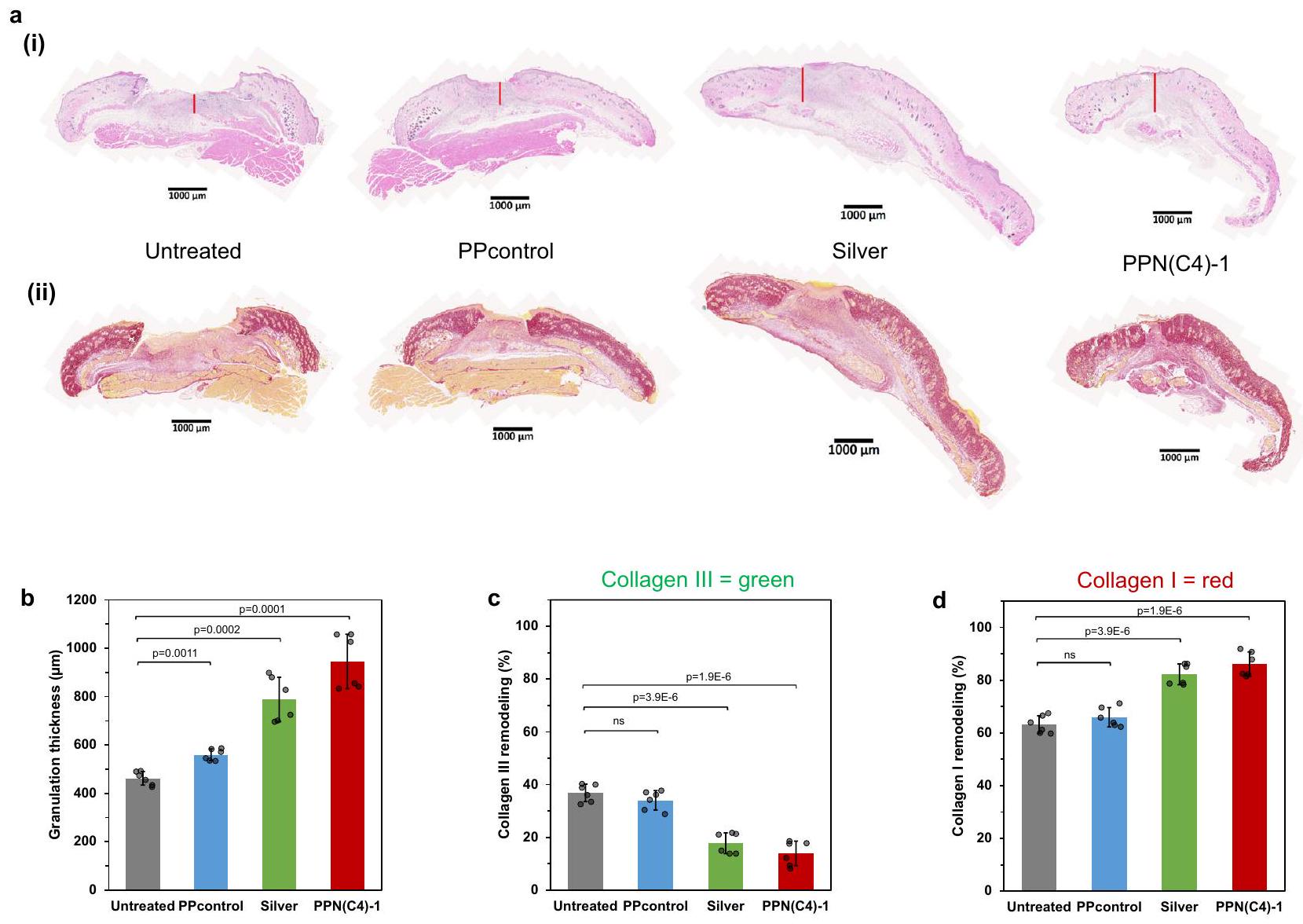 بعد 7 أيام من العلاجات، قمنا بإجراء تقييمات هيستولوجية باستخدام صبغة H&E على أنسجة الجروح. بالمقارنة مع الجروح غير المعالجة والجروح المعالجة بـ PPcontrol، أظهرت الجروح المعالجة بالفضة وPPN(C4)-1 هيدروجيل زيادة ملحوظة في سمك أنسجة التكوين (المعلمة بخط أحمر عمودي في الشكل 6a(i))، مما يشير إلى تعزيز الشفاء مع زيادة تكاثر الكيراتينocytes والأرومات الليفية (الشكل 6b). غالبًا ما يُلاحظ أنسجة التكوين الأكثر سمكًا، التي تتكون من الأرومات الليفية المتكاثرة، والأوعية الدموية، والمصفوفة خارج الخلوية، خلال عملية الشفاء الطبيعية للجروح.يوفر نسيج التجرانولاسيون هيكلاً لهجرة وتكاثر الخلايا الكيراتينية.وجود نسيج حبيبي أكثر سمكًا يشير إلى عملية شفاء جروح نشطة، مما قد يدل على تحسين تكاثر الكيراتينocytes. علاوة على ذلك، أظهرت الجروح المعالجة بهلام PPN(C4)-1 وجود لسانات ظهارية أكثر تطورًا مقارنةً بمجموعات العينات الأخرى (الشكل 6a(i)، الشكل التوضيحي 13)، مما يدل على زيادة تكاثر وهجرة الكيراتينocytes. تؤكد هذه الملاحظة أيضًا التأثير الإيجابي لعلاج هلام PPN(C4)-1 على شفاء الجروح. كما قمنا بتحليل إعادة تشكيل الكولاجين في أنسجة الجروح بعد 7 أيام من العلاجات باستخدام صبغة بيكروسيرياس الحمراء (الشكل 6a(ii)، الشكل التوضيحي