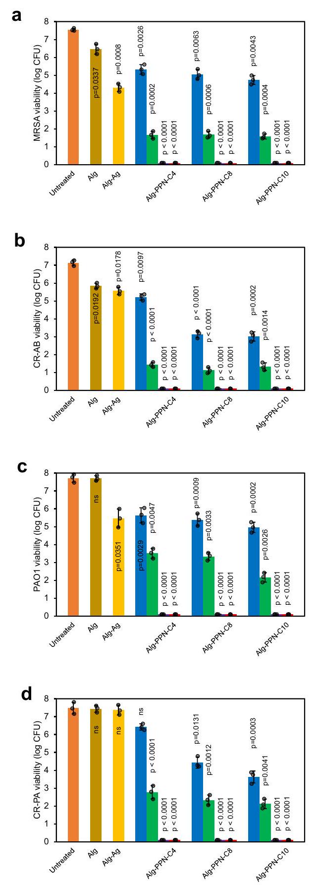 Contact killing efficacies of the Alg-PPN and control fibers were measured in vitro against various MDR Gram-negative and Grampositive bacteria, specifically MRSA USA300, PAO1, CR-PA and CR-AB. The Alg-Com and control Alg fibers did not exhibit bactericidal properties (Fig. 7a-d). The Alg-PPN(Cn)-5 and Alg-PPN(Cn)-10 fibers totally eradicated (in 1 h ) Gram-positive MRSA USA300 and CR-AB, as well as Gram-negative PAO1 and CR-PA bacteria, which were inoculated onto the fibers (Fig. 7a-d, Supplementary Tables 6-8). The Alg-PPN(Cn)-0.1 and Alg-PPN(Cn)-1 fibers did not completely eradicate the bacteria (Fig. ), probably due to the lower concentration of the active antibacterial PIM(Cn)-Mal tethered to the fibers.