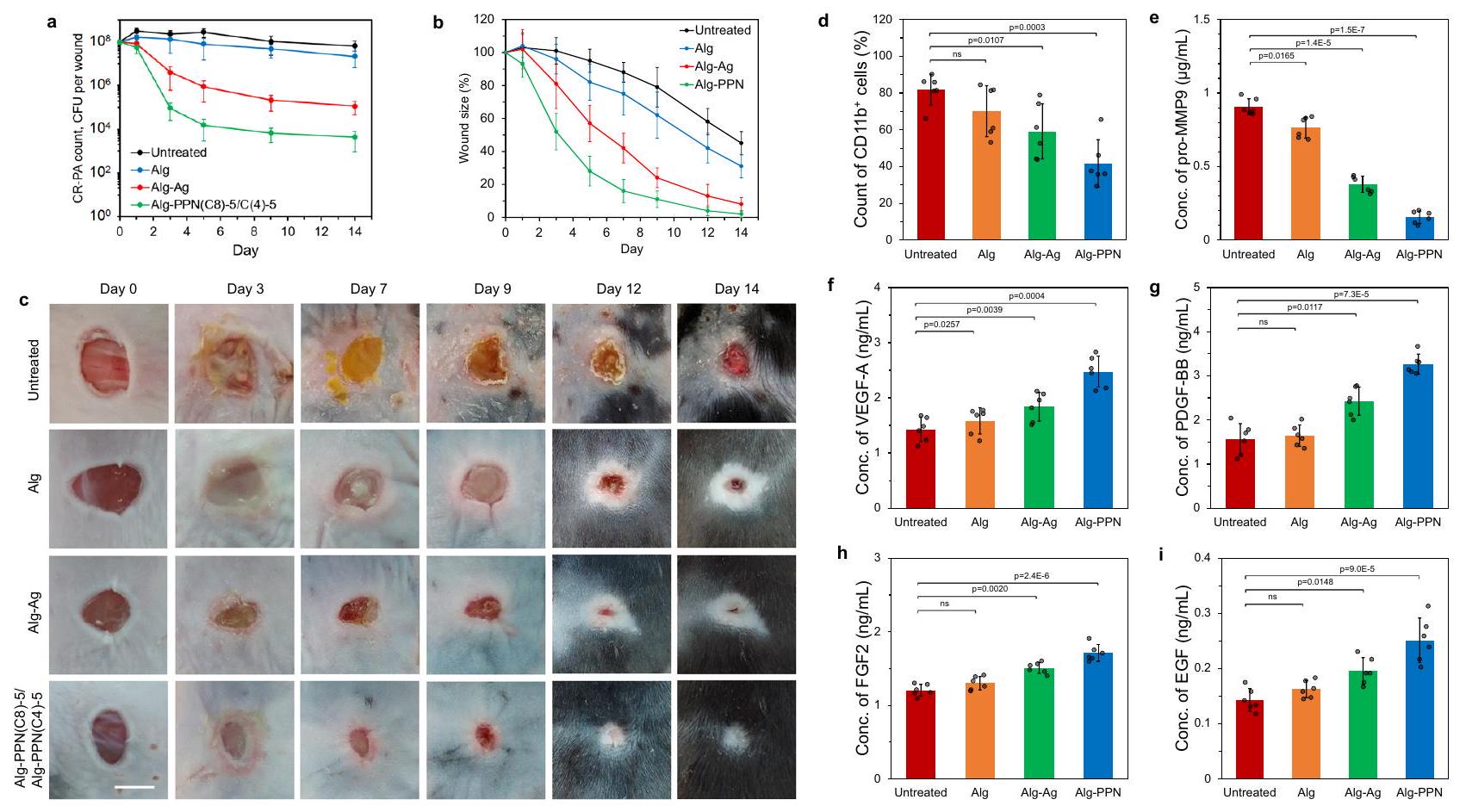 inflammatory responses in the wound tissues. (Ly6G is a specific marker for mouse neutrophils.) The population of Ly6G cells on the Alg-PPN-treated wounds was also lower than that on the Alg-Ag-treated wounds (Supplementary Fig. 21a). These results suggest the efficacy of Alg-PPN over Alg-Ag in the killing of wound site bacteria, which alleviates the bioburdens on infected wounds for accelerated healing. Neutrophils are among the earliest immune cells to arrive at wound sites. Thus, for the untreated and Alg control groups, high percentages of CD11b cells but low Ly6G-positive neutrophils suggest that the inflammation has advanced beyond the early phase.