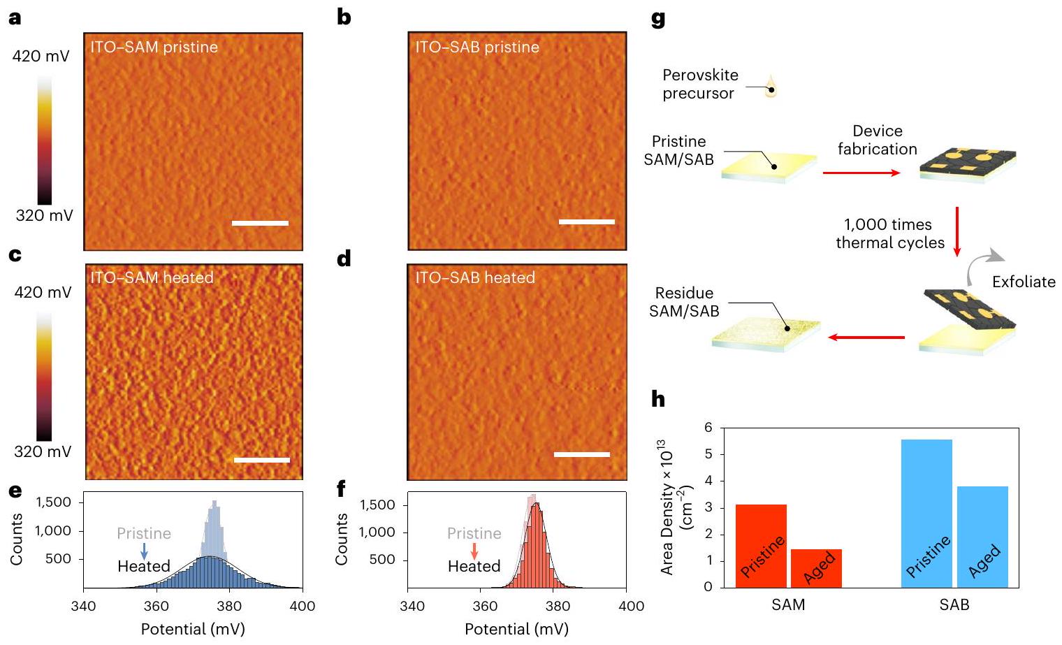 Fig. 2 | Temperature stability of SAB. a-d, Surface potential images of the molecular contacts. a,b, Pristine ITO/SAM (a) and ITO/SAB (b) before thermal annealing at for , ITO/SAM (c) and ITO/SAB (d) after thermal annealing at for 200 h . Scale bars, 500 nm . e,f, Statistical potential distributions of ITO-2PACz (e) and ITO-SAB (f) surfaces. Gaussian distributions