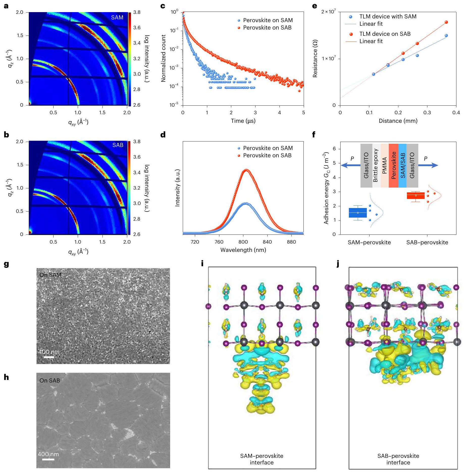 Fig. 3 | Perovskite-molecular contact interface properties. a,b, GIWAXS patterns of perovskite films deposited on SAM (a) and SAB (b). c-f, TRPL spectra (c), PL spectra (d), TLM-measured resistance (e) and statistical distribution of adhesion energies from four measurements (f) for devices incorporating perovskite-SAM or perovskite-SAB interfaces. In e, the lines represent linear fits; In the boxplot in , the medians (central lines), averages (hollow data points), quartiles and interquartile ranges (whiskers) are shown; in represents load force. g,h, SEM images of buried perovskite surfaces delaminated from