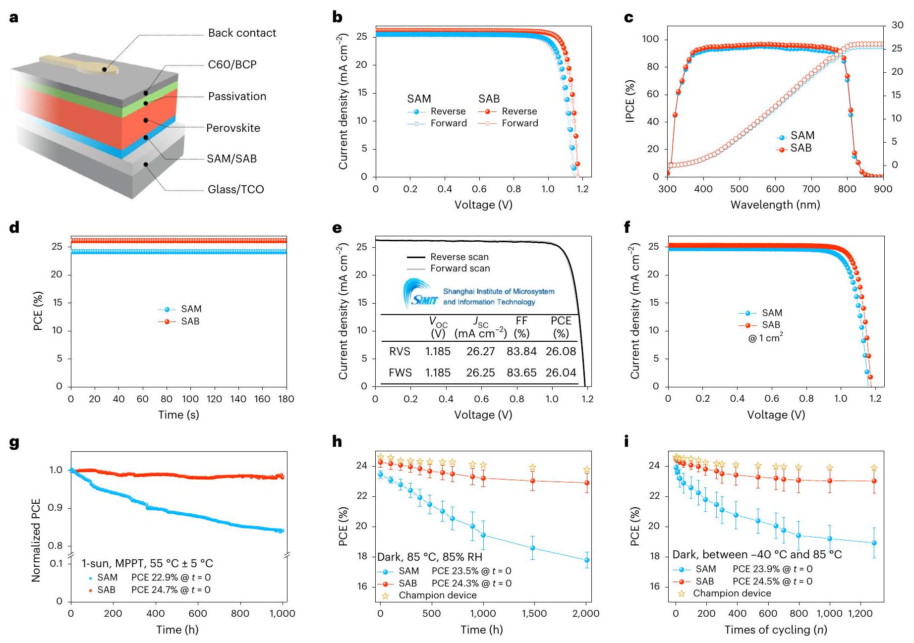 قمنا بتصنيع خلايا شمسية من نوع PSC باستخدام تكوين جهاز مقلوب: ITO-SAM أو SAB-بيروفسكايت-فوليرين )/بايثوكوبروين (BCP)/فضة (شكل 4أ). الشكل 4ب يوضح التيار-الجهد ( ) خصائص أجهزة SAM و SAB ذات الأداء الأعلى، المقاسة في كلا اتجاهي المسح الأمامي والعكسي. أظهرت جهاز SAB الرائد كفاءة تحويل الطاقة (PCE) قدرها مع جهد دائرة مفتوحة ( ) من 1.174 فولت، تيار قصر ( ) من وعامل ملء (FF) منمن المقدمةمسح، يظهر عدم وجود هيسترسيس في الأداء. هذا يمثل تحسينات على PCEs لـ (مسح عكسي) و (مسح أمامي) لجهاز البطل SAM (الشكل 4ب). لاحظنا أن قيم منتتناسب المباريات مع المتكاملالمستمدة من قياسات كفاءة الفوتون إلى التيار (IPCE): لجهاز SAM و لجهاز SAB (الشكل 4c)؛ علاوة على ذلك، تتوافق قيم كفاءة تحويل الطاقة (PCE) مع تلك الناتجة من قياسات خرج الطاقة الثابتة (SPO) (الشكل 4d). متوسط كفاءة تحويل الطاقة هو تم تسجيله ضمن مجموعة من 20 جهاز SAB، متجاوزًا متوسط كفاءة تحويل الطاقة البالغ 24.1% الذي تم الحصول عليه في 20 جهاز SAM، مع تحسينات في جميع معلمات الخلايا الشمسية (الشكل التكميلي 41 والجداول التكملية 1 و2).