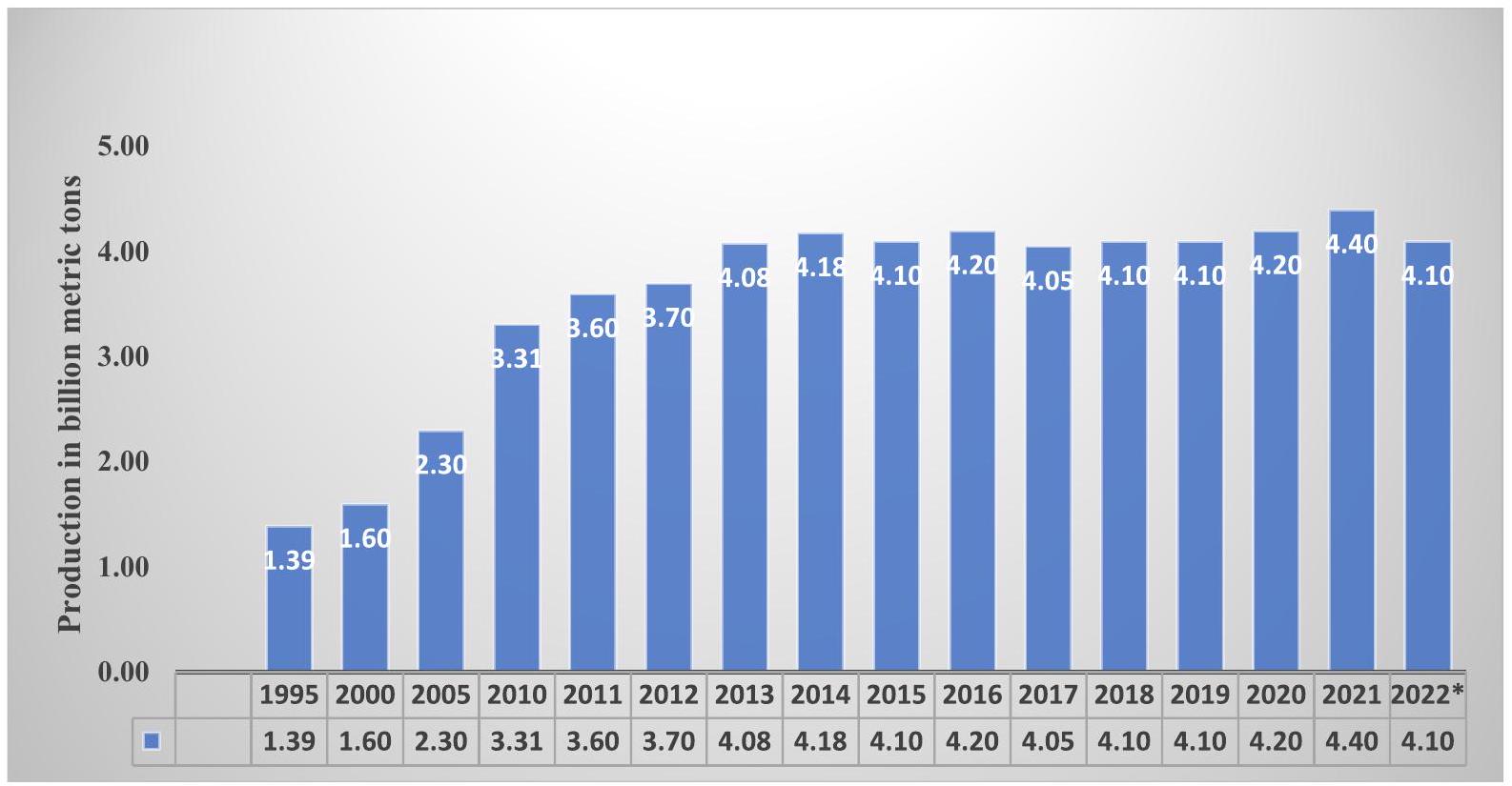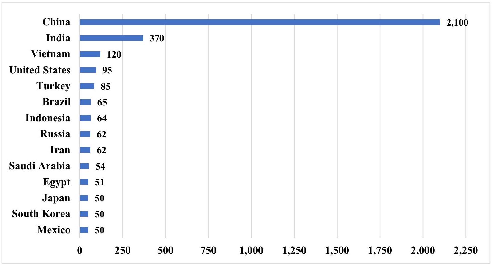 enormous 2.1 billion Mt. in 2022, which surpasses any other country by a significant margin. China produced more than 50% of total global cement production in 2022. India, the second-largest cement producer worldwide, fell far behind with a production volume of 370 million Mt. Vietnam was third on the worldwide list, producing 120 million Mt. of cement the same year. In 2022, the USA produced approximately 95 Mt . of cement and came fourth among the top cement-producing countries worldwide. Cement production consumes a substantial amount of energy and produces a significant amount of carbon dioxide