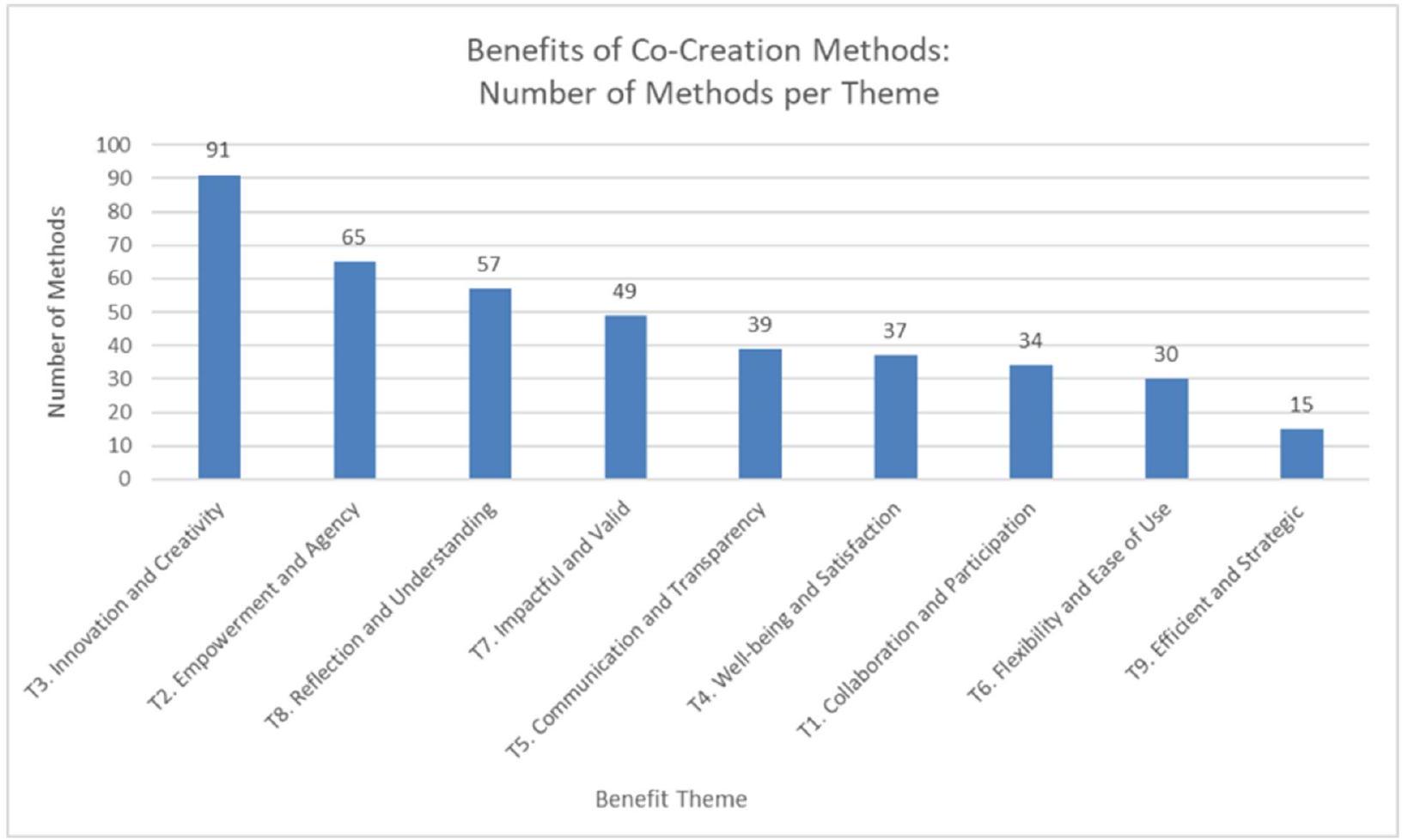 In contrast ‘Efficient and Strategic’ (15 methods) were the least frequently reported. This points out a potential gap in the literature and an opportunity for further exploration of how co-creation can enable rapid assessments, integrate local insights efficiently, and foster strategic action planning.