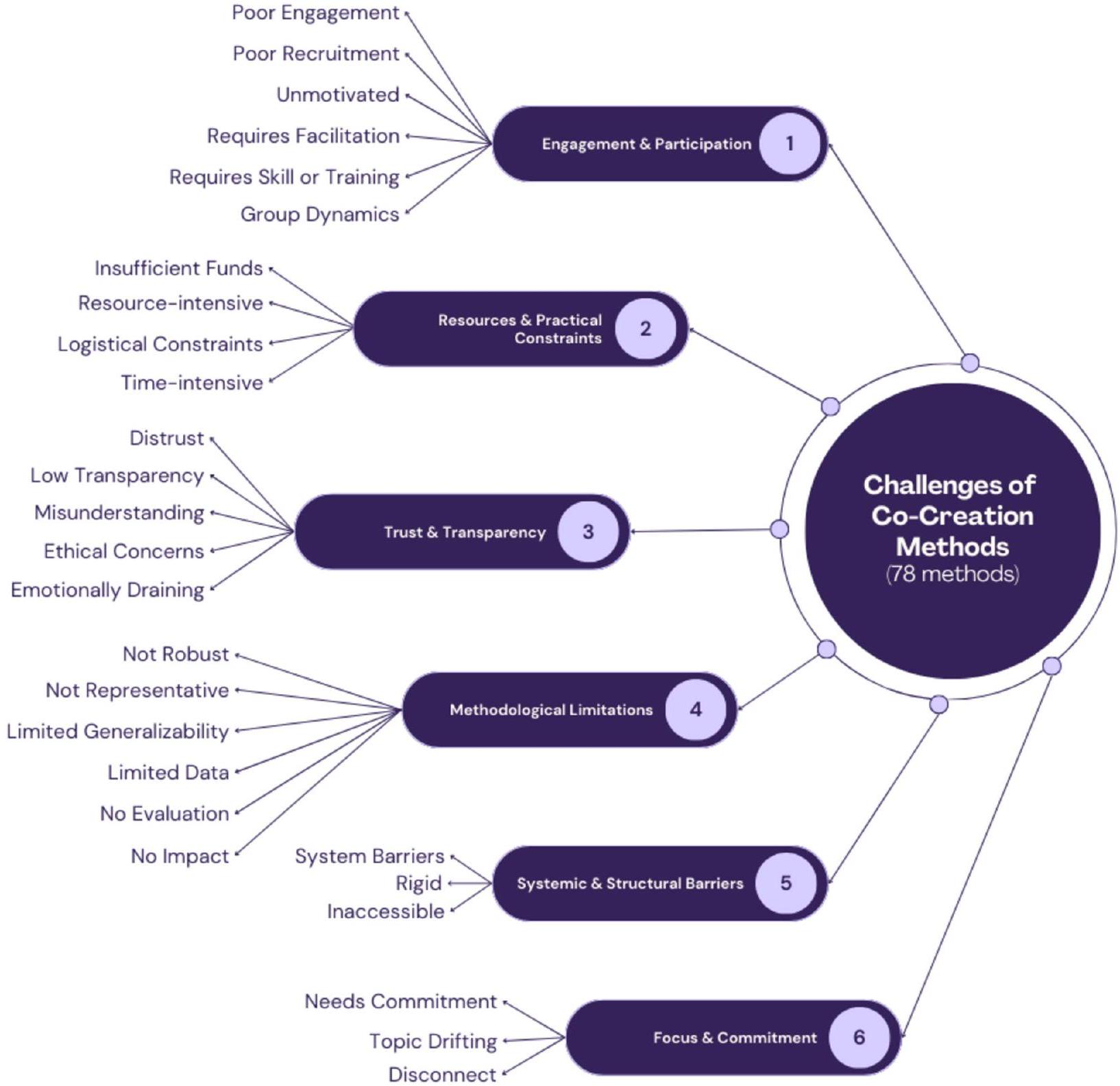 and significant time investment. These challenges are particularly evident in large-scale or long-term projects, where the resource-intensive nature of co-creation methods can become overwhelming [62,63,66,112,115,158].