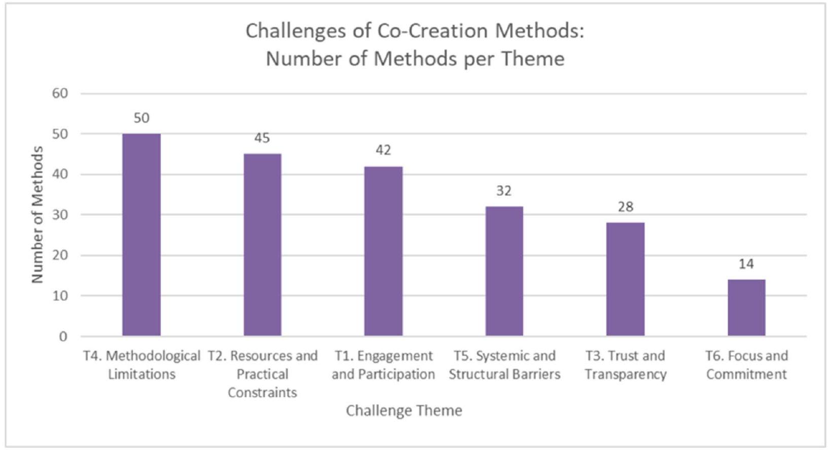 Low transparency in co-creation methods raises concerns about the accuracy, effectiveness, and clarity of research outcomes. Some methods suffer from unclear goals or outputs, making it challenging for participants to understand their role or how findings are derived. As O’Reilly-deBrún describes Direct Ranking may also face challenges related to unclear outcomes or goals [54], while Voinov et al. showcase that Agent-Based Modeling (ABM) suffers from “low transparency,” [45]. These concerns may lead to skepticism and decreased engagement.