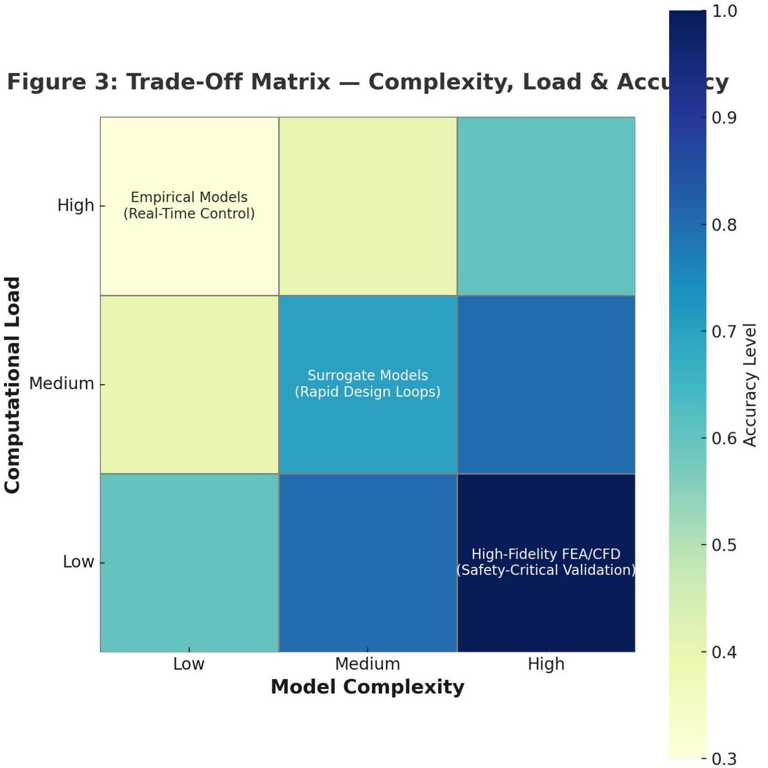 Figure 3 below supports this section by visualizing the trade-off between model complexity, computational burden, and accuracy, as applied across various industrial use cases such as real-time monitoring, structural optimization, and design prototyping.