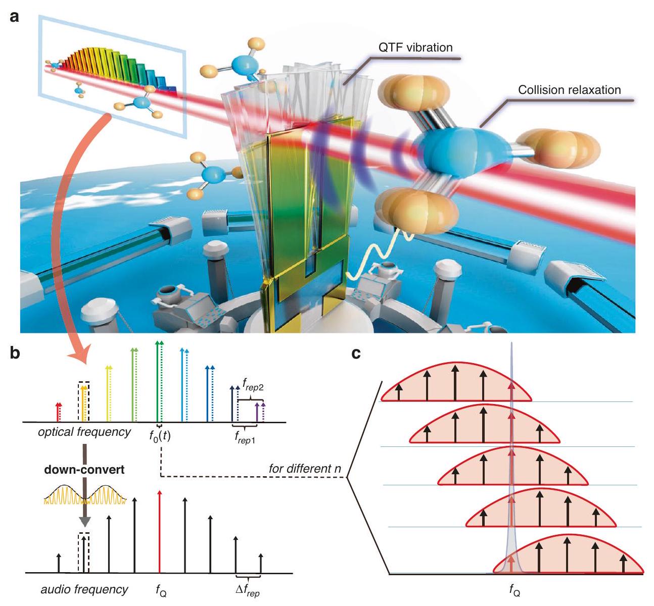 In this manuscript, we provide a proof-of-concept of the QEMR-PAS technique. The beat frequency response from a dual comb is down-converted to the audio frequency domain. The energy levels of gas molecules are used as optical-acoustic converters, generating multiheterodyne sound signals. A QTF is used to “listen” to the sound resonant with its fundamental flexural mode from the multiheterodyne signals and convert it into a current signal. With this approach, a large-dynamic-range, highresolution, broad-bandwidth dual-comb spectrometer is achieved within a small footprint.