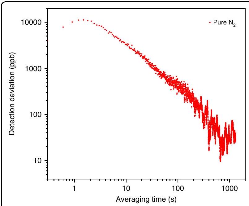 To assess the long-term stability of the QEMR-PAS system, an Allan variance analysis for the main comb tooth component (