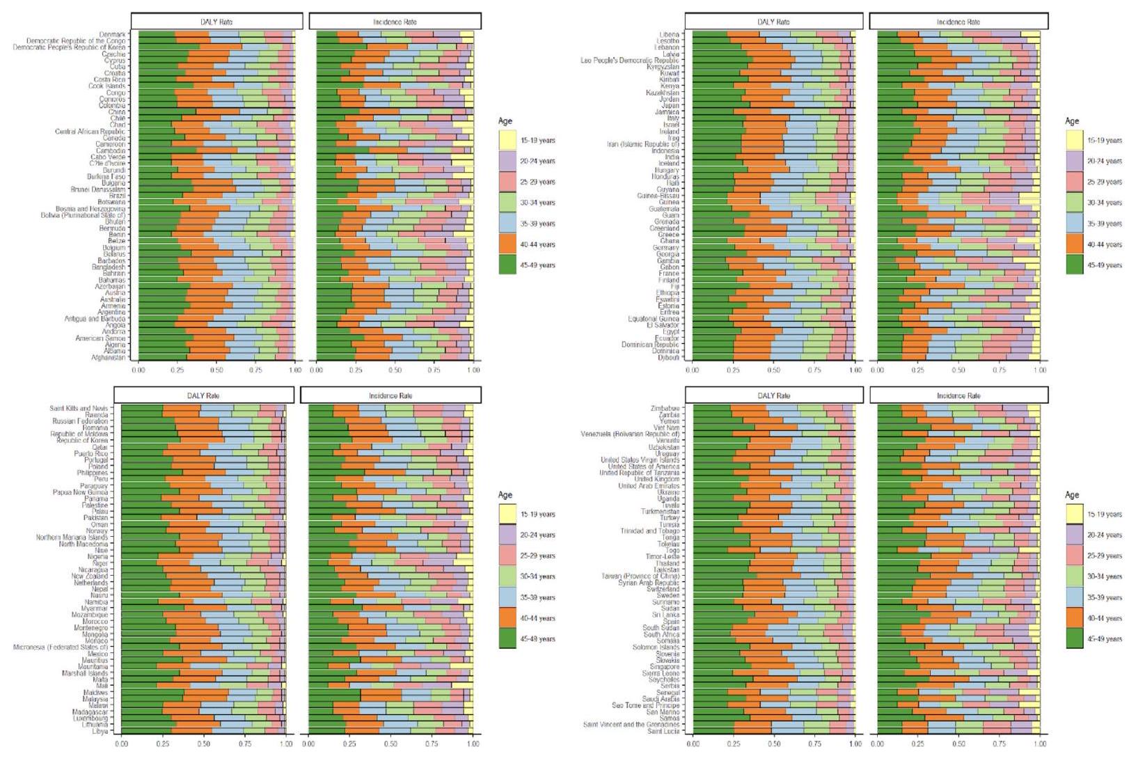 Fig. 2. Proportion of DALY rate and incidence rate of periodontal disease for young adults of 15-49 ages in countries around the world in 2019.
