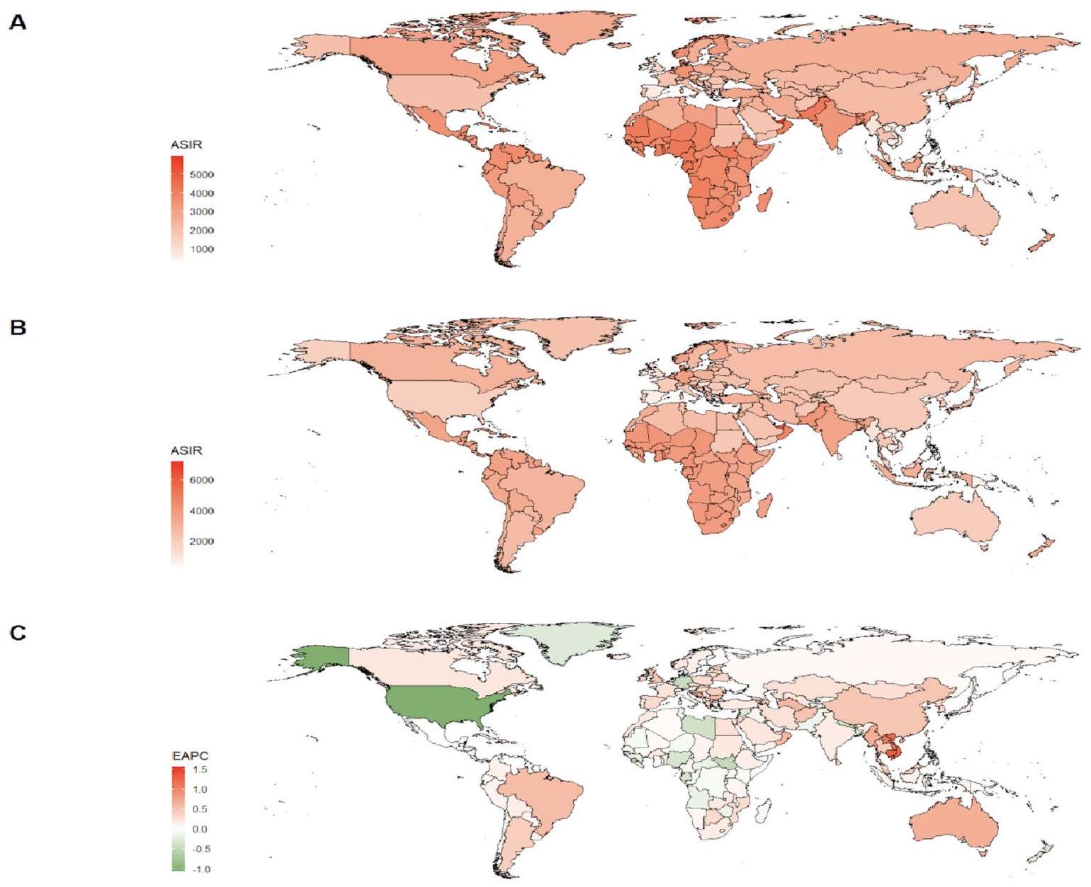 Fig. 3. (A) ASIR of periodontal disease for young adults around the world in 1990; (B) ASIR of periodontal disease for young adults around the world in 2019; (C) EAPC of ASIR for periodontal disease for young adults in countries worldwide from 1990 to 2019.