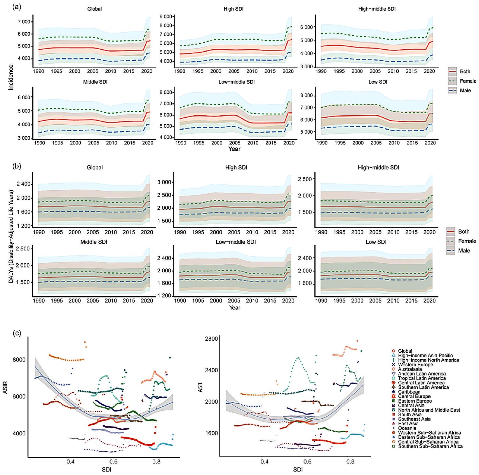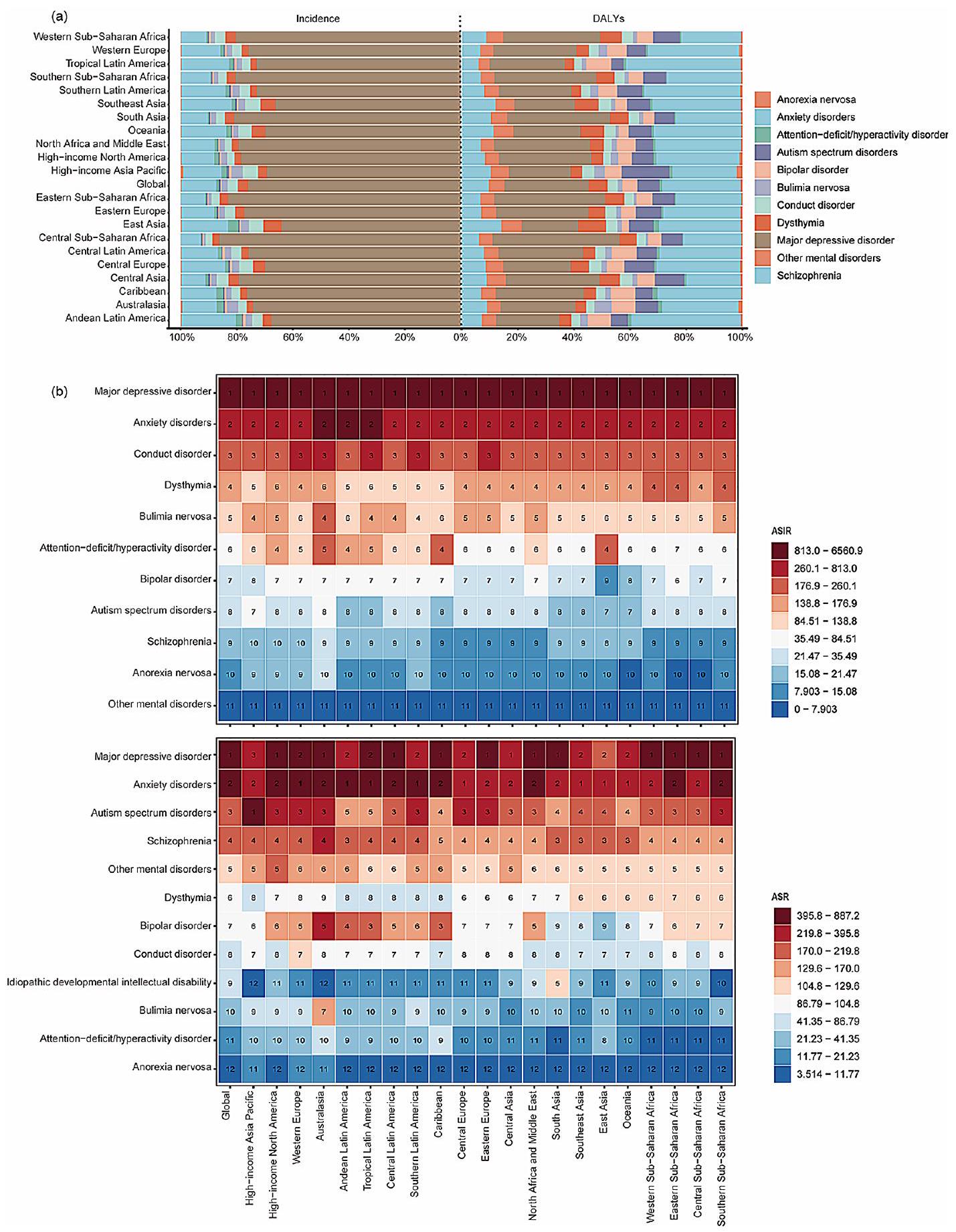 The disease burden was considerably heavy in most regions. Our research findings indicated that the ASR for mental disorders was highest in high SDI and lowest in parts of Sub-Saharan Africa and Asia, consistent with