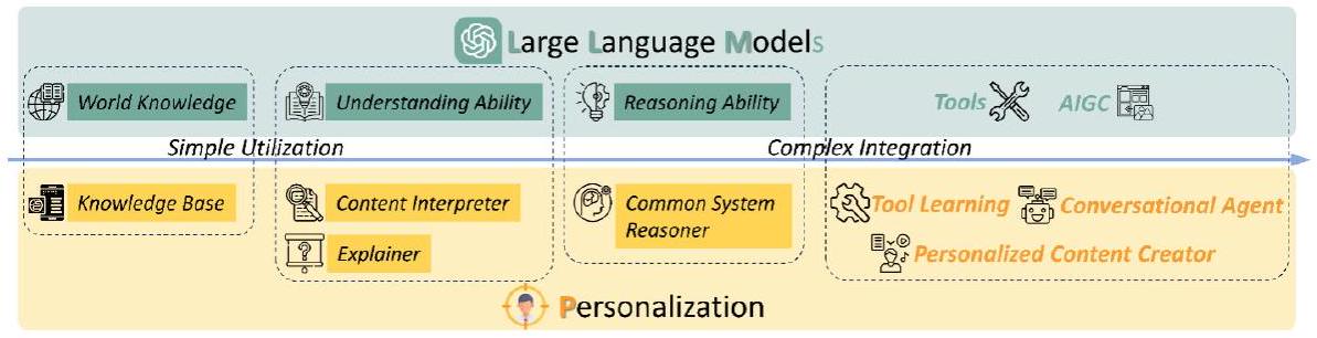Tool learning has found applications in various fields, and this section primarily focuses on tool learning paradigms based on large language models (LLMs). While recent works often involve a combination of these two perspectives, we do not specifically categorize each work into one type. LLMs, such as GPT, are well-suited for tool learning applications [233]. With their powerful natural language processing capabilities, LLMs can break down complex tasks into smaller sub-tasks and convert them into executable instructions. Specialized tools allow LLMs to access knowledge that is beyond their own understanding. By integrating specialized tools, LLMs can better understand and then address complex problems, offering more accurate and efficient solutions for personalized systems.