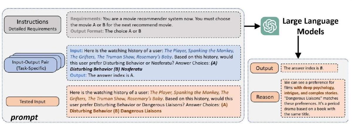 intelligence for decision-making and problem-solving. By providing the models with the ‘chain of thoughts’ [38], such as prompting with ‘let us think about it step by step’, the large language models exhibit emergent abilities for reasoning and can arrive at conclusions or judgments according to the evidence or logics. Accordingly, for recommender systems, large language models are capable of reasoning to help user interest mining, thus improving performance.