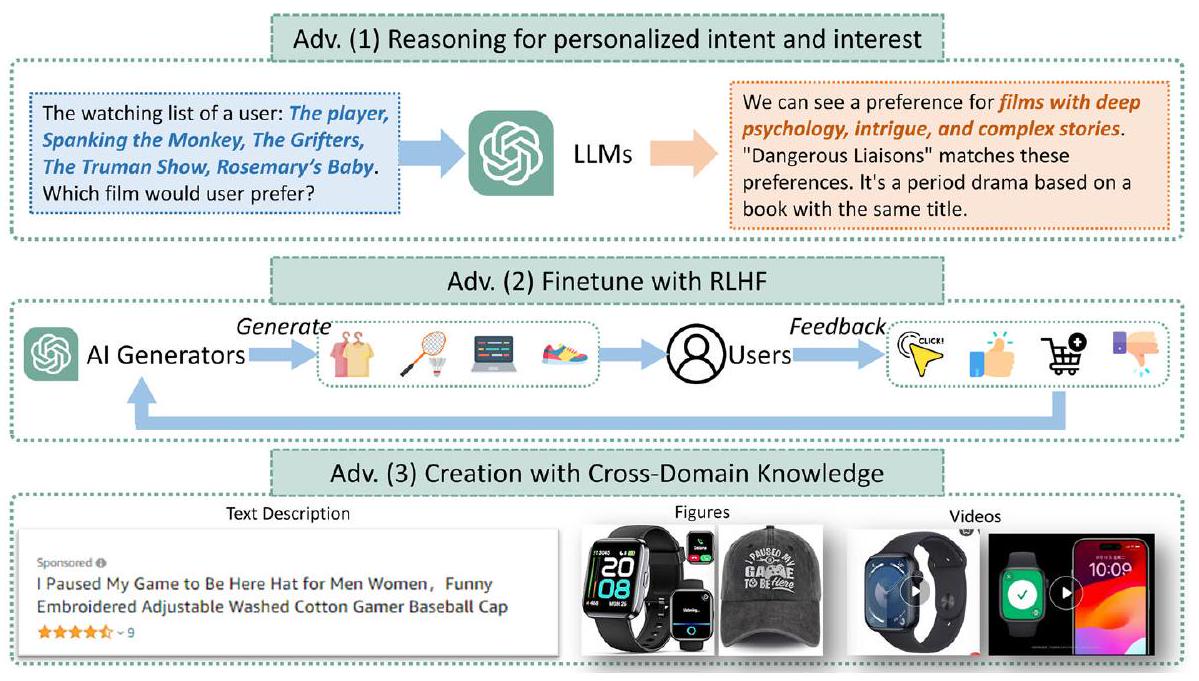 | KRec [82] | علاقة تكميلية | توقع CTR | ChatGPT 3.5، ChatGLM 2 | بيانات Alipay |