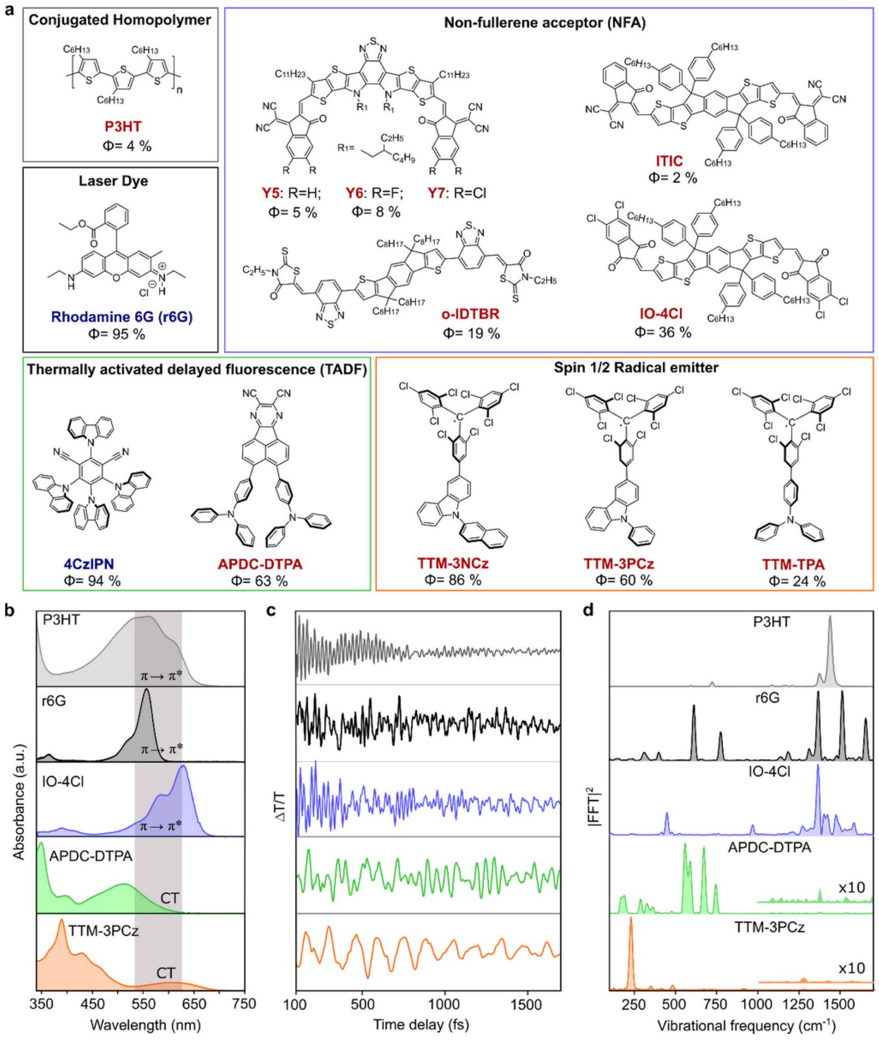 اقتران الإثيون-الاهتزاز تم الكشف عنه باستخدام مطيافية الاهتزازات المفاجئة فائقة السرعة. أ، الهيكل الجزيئي لاثني عشر مادة عضوية مستخدمة في هذه الدراسة والتي تقع في فئات البوليمر المتجانس، صبغة الليزر، المتقبلات غير الكاملة (NFA)، TADF ومصدر الجذور. يتم تمييز اسم الجزيء باللون الأحمر إذا كانت ذروة الانبعاث المقابلة فوق 650 نانومتر. يتم الإشارة إلى أقصى قيم PLQEs المبلغ عنها، , أطياف الامتصاص والانتقال المعني للتنشيط المفاجئ.
