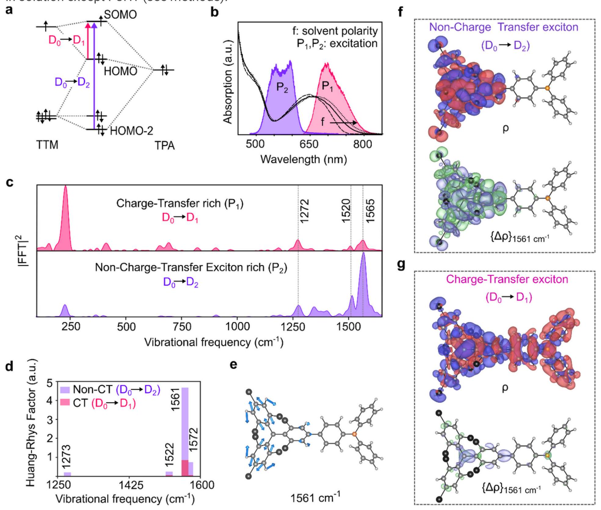 Isolation of the vibrational coupling for the charge-transfer and non-charge transfer exciton of an efficient doublet emitter. a, Purple and magenta arrows indicate the transition involved in the molecular orbital level used for the band selective excitation , Steady-state absorption spectra of TTM-TPA in different solvents with variable polarity (f: Cyclohexane ). The magenta and purple colored filled area indicate the spectral profile of impulsive pumps ( ) used to excite different bands. , Excited-state vibrational spectra obtained from vibrational coherence generated at early timescales (1001500 fs ) upon exciting with magenta and purple impulsive pumps. d, Theoretically calculated excitonvibration coupling parameter, the so-called, Huang-Rhys factor ( ), for the and excited states of TTM-TPA in the high-frequency regime for the experimentally obtained modes. e, Vector displacement diagram of the high-frequency breathing mode with frequency plotted on the optimized geometry of TTM-TPA. : the exciton wavefunction (transition density) for the (non-charge transfer exciton) transition and (charge-transfer exciton). bottom : the differential exciton wavefunction (transition density) upon displacement along the mode plotted for (non-charge transfer exciton) transition and (charge-transfer exciton) respectively.