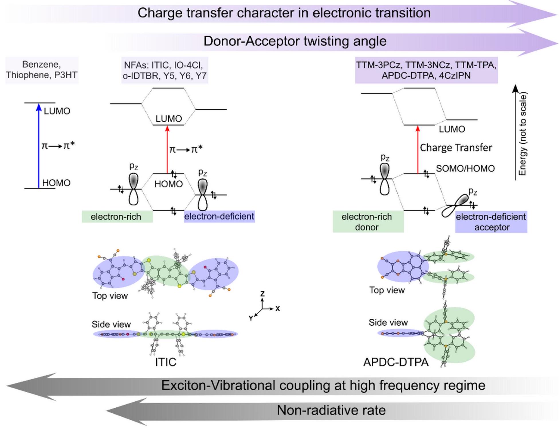 مخطط لمبدأ التصميم المتوقع لتقليل الفقد غير الإشعاعي في أشباه الموصلات العضوية على المستوى الجزيئي الفردي: تم دراسة فئتين رئيسيتين من الجزيئات ذات فجوة نطاق منخفضة بناءً على شخصية انتقال الشحنة لأدنى انتقال إلكتروني للطاقة هما 1) شخصية انتقال الشحنة الضعيفة: ITIC، IO-4CI، o-IDTBR، Y5، Y6، Y7. 2) شخصية انتقال الشحنة القوية: TTM-3PCz، TTM-3NCz، TTM-TPA، APDC-DTPA، 4CzIPN.. تداخل قوي -المدارات في الجزيء المسطح مع الحلقات المدمجة يمكّن المدارات الجزيئية الحدودية من أن تساهم بها كل من الجزء الغني بالإلكترونات والجزء الفقير بالإلكترونات. هذا يؤدي إلى تنشيطات ضوئية مع تداخل قوي بين HOMO وLUMO والاقتران بتمدد C-C لمثل هذه الانتقالات قوي (تمثيل: ITIC). على العكس، الزاوية الثنائية غير الصفرية بين الجزء الغني بالإلكترونات والجزء الفقير بالإلكترونات الناتجة عن العوائق الحجمية تقيد التهجين للمدارات -. هذا يؤدي إلى انتقال الشحنة داخل الجزيء في الانتقال الإلكتروني الذي يرتبط باقتران مخفف للاهتزازات عالية التردد مثل تمدد C-C.