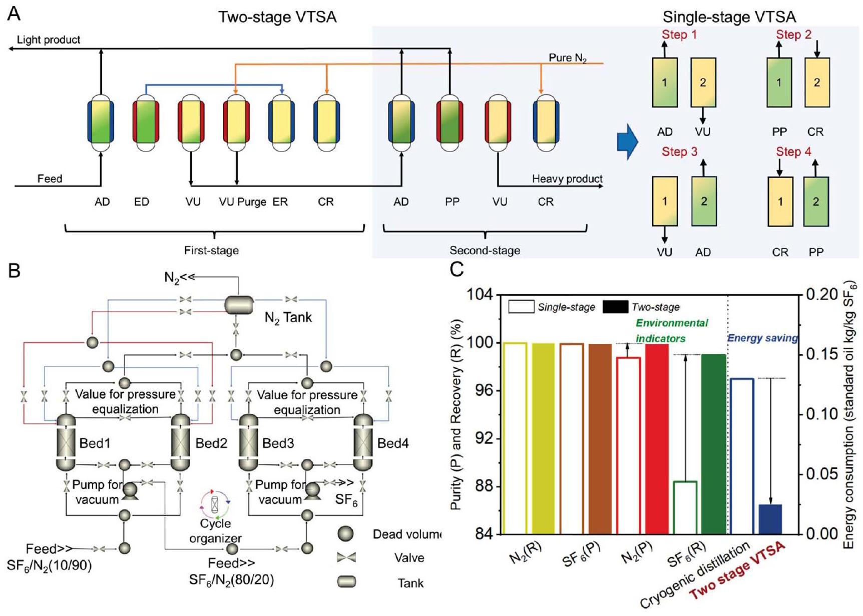 B Schematic model of the two-stage VTSA process. C Simulation results of singlestage and two-stage VTSA and energy consumption for two-stage VTSA and cryogenic distillation.