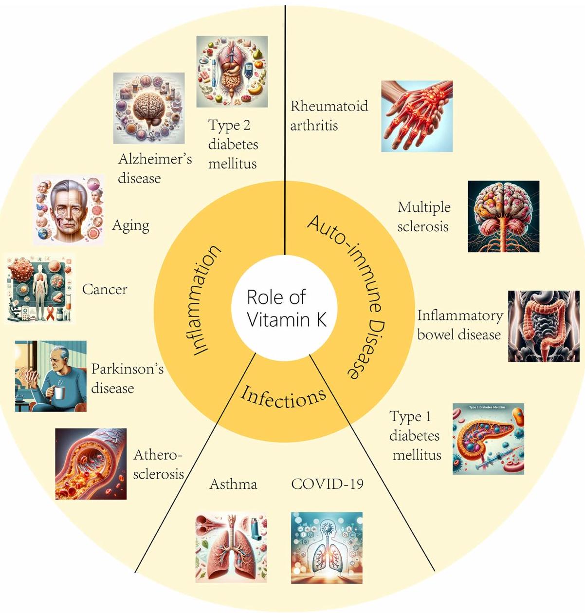 فيتامين ك (VK) يتكون من مجموعة من المواد ذات النشاط الحيوي الكلوروفيل الكينون ويظهر في الطبيعة في شكل VK1 و VK2. نظرًا لأن التعرف الأول عليه نشأ من قدرته على تعزيز تجلط الدم، فإنه يعرف بفيتامين التجلط. ومع ذلك، استنادًا إلى أبحاث واسعة، أظهر VK إمكانات للوقاية والعلاج من أمراض مختلفة. الدراسات التي تظهر التأثيرات المفيدة لـ VK على المناعة، والقدرة المضادة للأكسدة، وتنظيم الميكروبات المعوية، وتطور الظهارة، وحماية العظام قد جذبت اهتمامًا متزايدًا في السنوات الأخيرة. تركز هذه المقالة الاستعراضية على آلية عمل VK وتأثيراته الوقائية والعلاجية المحتملة على العدوى (مثل الربو، COVID-19)، الالتهاب (مثل في مرض السكري من النوع 2، مرض الزهايمر، مرض باركنسون، السرطان، الشيخوخة، تصلب الشرايين) واضطرابات المناعة الذاتية (مثل مرض الأمعاء الالتهابي، مرض السكري من النوع 1، التصلب المتعدد، التهاب المفاصل الروماتويدي). بالإضافة إلى ذلك، تعتبر البروتينات المعتمدة على VK (VKDPs) آلية حاسمة أخرى يمارس من خلالها VK تأثيرات مضادة للالتهابات ومعدلة للمناعة. تستكشف هذه المراجعة الدور المحتمل لـ VK في منع الشيخوخة، ومكافحة الاضطرابات العصبية، وعلاج الأمراض مثل السرطان والسكري. على الرغم من أن الأبحاث الحالية تعين VK كأداة علاجية للتطبيقات السريرية العملية في العدوى، والالتهابات، والأمراض المناعية الذاتية، إلا أن الأبحاث المستقبلية ضرورية لتوضيح آلية العمل بمزيد من التفصيل والتغلب على القيود الحالية.