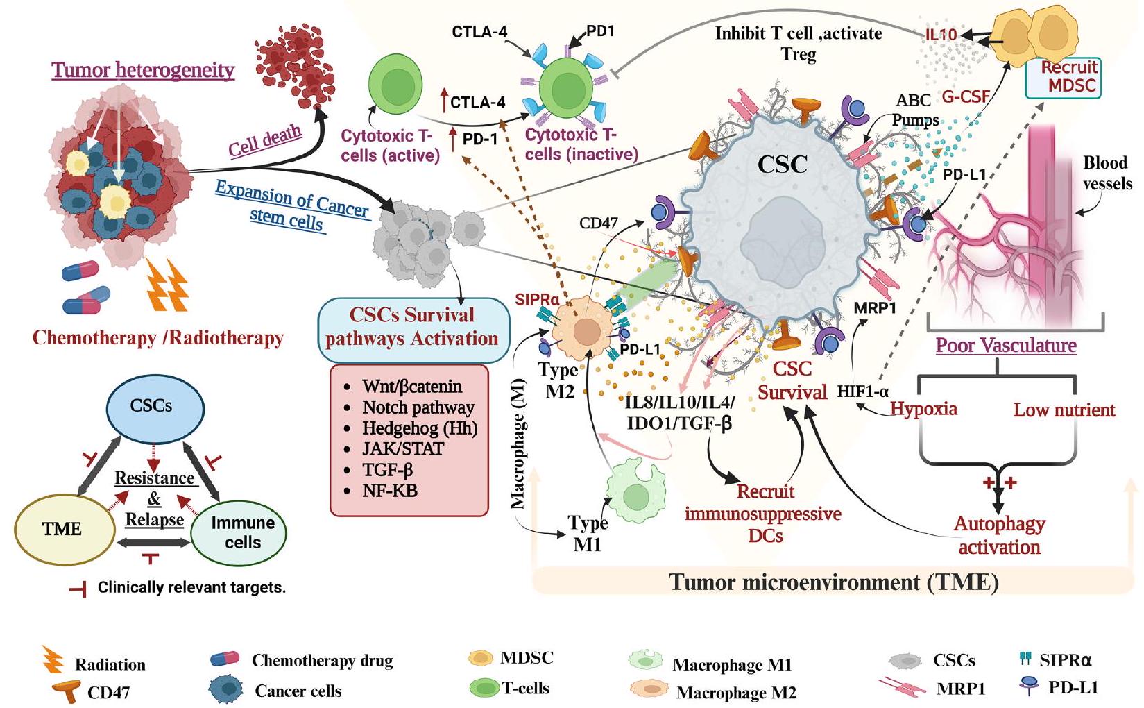 السرطان، الخلايا الجذعية السرطانية المستندة إلى نقص الأكسجين تجذب الخلايا المناعية المثبطة للورم إلى موقع الورم من خلال إشارات ENTPD2/CD39 L1 وتوقف علاج PD1، وتقليل الخلايا المناعية المثبطة يجعل هذه الخلايا أكثر حساسية لـ 5-FU. تم تقديم خلايا CAR T (خلايا T المستقبلة لمستضدات هجينة) مؤخرًا كعلاج معدّل لخلايا الدم البيضاء المضيفة، وقد أحدثت ثورة في العلاج المناعي ضد السرطان لتجاوز حاجز التخصص وعدم الاستجابة للعلاج القياسي، وتم تجربتها لأول مرة على مرضى اللوكيميا اللمفاوية الحادة (ALL) مع تحسن في الشفاء. ومع ذلك، فإن التهديد المستمر لتطوير متلازمة إطلاق السيتوكينات (CRS) والانتكاسة المبكرة لسرطان الدم الإيجابي للمستضد (فقدان المراقبة النشطة لخلايا CAR T) أو الانتكاسة اللاحقة (فقدان المستضد) للورم، قد حد من نطاق خلايا CAR T المحددة. ومع ذلك، فإن العلاج المشترك الأخير لخلايا CAR T مع المناعية المعدلة (مثبطات نقاط التفتيش المناعية مثل حجب PDL1-PD1) قد أظهر نتائج واعدة من حيث عمق ودوام العلاج سريريًا. الوصف أعلاه يسلط الضوء على أهمية التفاعل الثلاثي ‘CSC-TME-المناعة’ في توسيع الورم ومقاومة العلاج وأهميته السريرية. تم عرض تمثيل شامل لارتباط المناعة والخلايا الجذعية السرطانية في مقاومة الأدوية في الشكل 2.