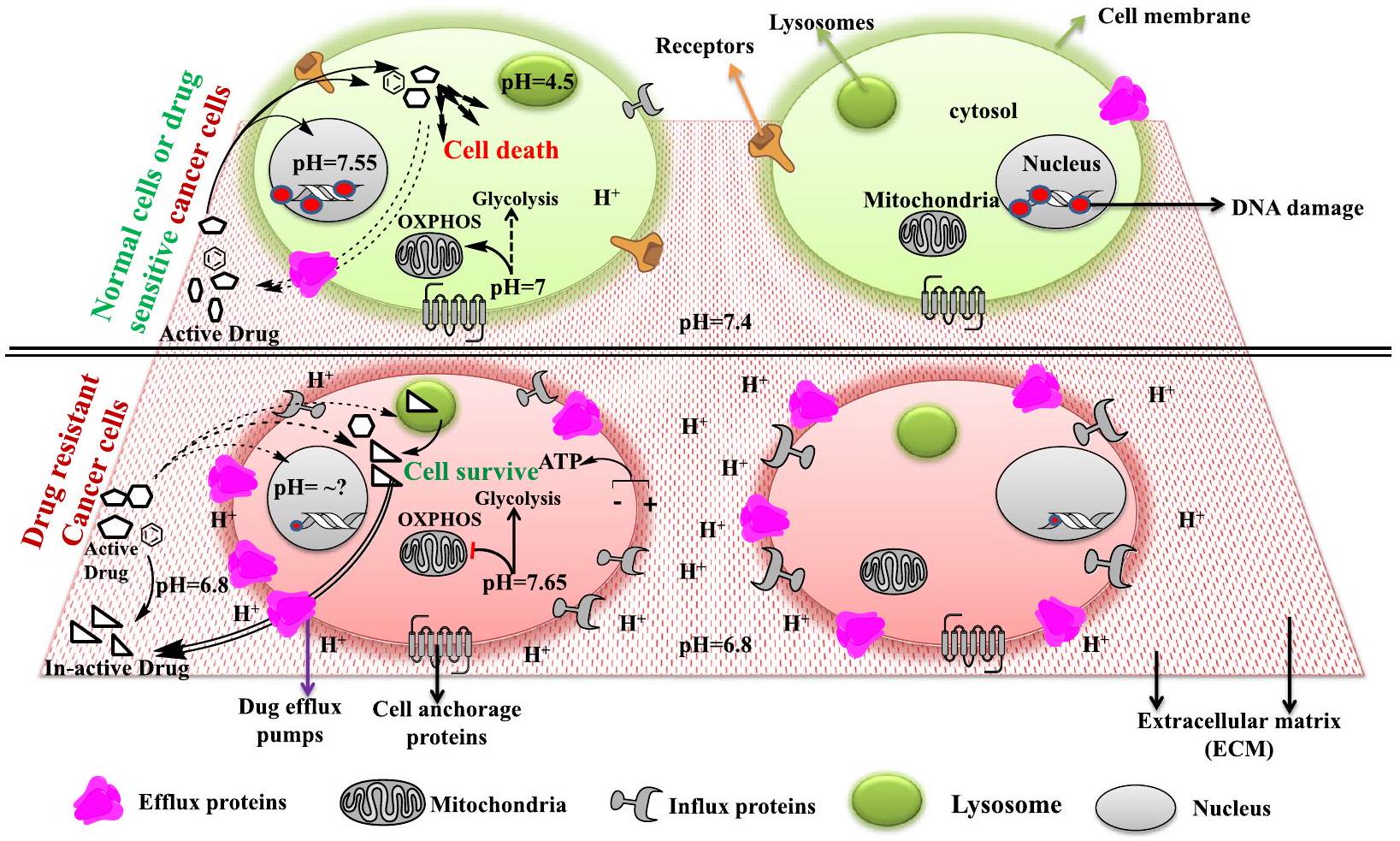الموقع تحت الخلوي مع تأثير أقل على تغيير الرقم الهيدروجيني. تعتبر الإندوليسوزومات مكونًا مهمًا من العملية التحليلية داخل الخلايا المعروفة باسم الالتهام الذاتي، والتي تزيل الجزيئات الحيوية الزائدة وغير المعروفة والمشوهة وغير المستخدمة من الخلايا عن طريق تكسيرها إلى وحدات بناء أصغر أو وحدات طاقة للخلايا. تشير تقارير متنوعة إلى أن الرقم الهيدروجيني للإندوليسوزوم يلعب دورًا محوريًا في مقاومة الأدوية من خلال تراكم وتخزين أدوية العلاج الكيميائي المختلفة (وهي في الغالب قاعدة ضعيفة) التي تدخل إليها إما عن طريق الانتشار السلبي أو من خلال مضخات P-gp المدمجة في الغشاء، ثم يتم طردها لاحقًا عن طريق الإخراج الخلوي، مما يؤدي إلى توليد خلايا سرطانية مقاومة للعلاج الكيميائي. لذا فإن سلامة نفاذية غشاء الليزوزوم ضرورية لتكون خلايا السرطان مقاومة، ويمكن اعتبارها موضوعًا مهمًا من الناحية العلاجية. أظهرت دراسات متنوعة أن المحفزات لنفاذية غشاء الليزوزوم مثل الكلوروكين يمكن أن تؤدي إلى موت خلايا السرطان المقاومة عن طريق إطلاق الأدوية المخزنة والبروتيازومات مثل الكاتيبسين للعمل على النواة وتحفيز موت الخلايا المبرمج. علاوة على ذلك، يعزز الكلوروكين إطلاق أكسيد النيتريك الذي يثبط بشكل فعال نشاط P-gp ويؤدي إلى تراكم أدوية العلاج الكيميائي، مما يؤدي إلى الموت في سرطان الكبد المقاوم.