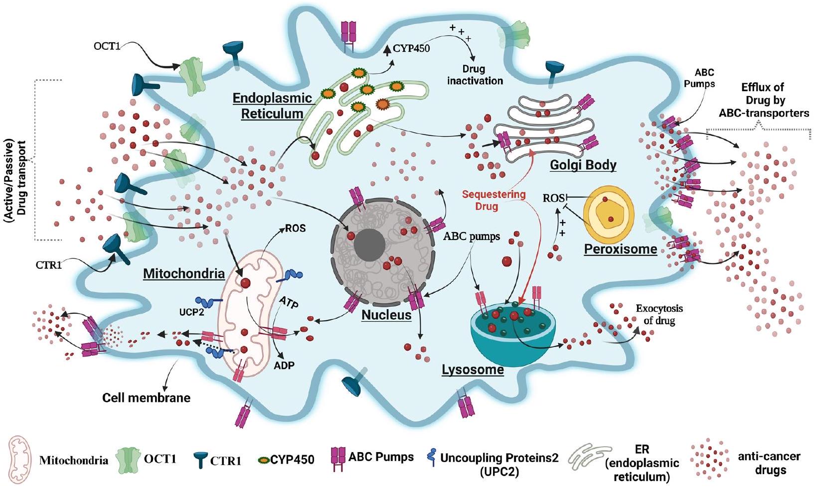 تظهر خلايا السرطان مقاومة للأدوية إما عن طريق تقليل الامتصاص أو تعزيز تدفق الأدوية أو كليهما من خلال مستقبلات وناقلات متحورة [315]. يمكن أن تنقل الناقلات المرتبطة بالغشاء المعروفة باسم بولي ببتيدات نقل الأنيونات العضوية (مثل OATP1B1 وOATP1B3 وOATP1A2) باكليتاكسيل، ميثوتريكسات، فلافوبيريدول، مثبطات كيناز التيروزين، إيرينوتيكان، سيسبلاتين وتلعب دورًا حاسمًا في المقاومة في الزوائد في الأمعاء الغليظة وسرطان القولون [316-319]. علاوة على ذلك، في سرطان الكبد الخلوي (HCC) وسرطان القناة الصفراوية (CGC) واللوكيميا النخاعية المزمنة (CML) يبدو أن تراكم أدوية السرطان أقل