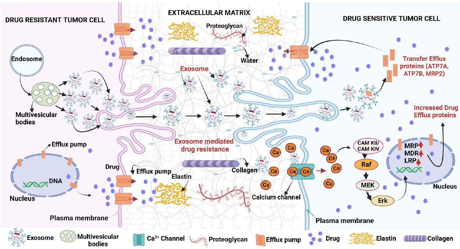 iii) الإكسوزومات: الإكسوزومات، المعروفة أيضًا باسم الحويصلات خارج الخلوية (EVs)، التي تنتجها الأجسام متعددة الحويصلات الكبيرة (MVBs)، تسهل التفاعل بين الخلايا من خلال نقل الحمولات الحيوية عبر الخلايا وتدفق الجزيئات غير المرغوب فيها في الخلايا السليمة [259]. إنها وسطاء إشارات مهمون، تلعب أدوارًا في نمو الورم، وإعادة تشكيل بيئة الورم، والنقائل، وتكوين الأوعية، فضلاً عن مقاومة العلاج [260، 261]. تقوم خلايا سرطانية مختلفة باختطاف EVs لتدفق الأدوية المضادة للسرطان مما يؤدي بدوره إلى مقاومة الأدوية كما هو موضح في الشكل 5 [262، 263]. تندمج الإكسوزومات المستمدة من خلايا الجذع الميزانشيمي (MSC) في خلايا الورم المعدي، مما يعزز تنشيط مسارات إشارات CaM-Ks وRaf/MEK/ERK downstream، مما يزيد من تعبير البروتينات المرتبطة بمقاومة الأدوية مما يؤدي إلى مقاومة كيميائية للسرطان المعدي [264]. أظهرت خلايا سرطان المبيض المقاومة للأدوية زيادة في تصدير الإكسوزومات من سيسبلاتين مع تجنيد الناقلات النازحة ATP7A وATP7B وMRP2 (ABCB2) في الخلايا المجاورة لحماية موت الخلايا الناتج عن الأدوية [265].