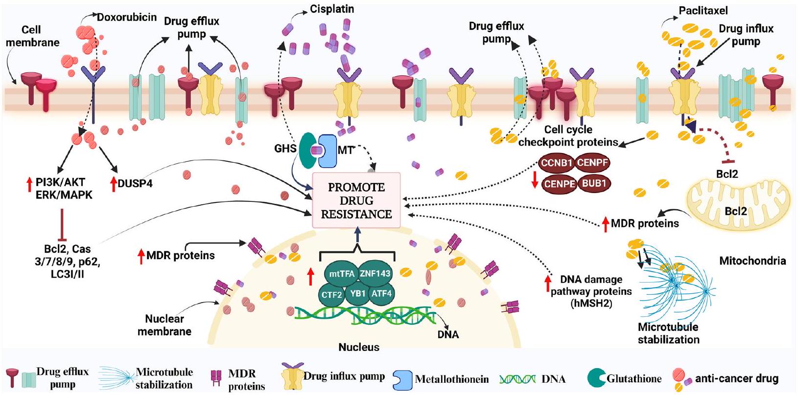 وبالمثل، فإن مقاومة السيسبلاتين تظل عائقًا في علاج أنواع مختلفة من السرطان. عند دخولها إلى الخلية، تتفاعل مع مجموعة من الجزيئات بخلاف الحمض النووي، مثل الجلوتاثيون المحتوي على الكبريت (GSH)/المعدن الثيونيين (MT) التي تحبس السيسبلاتين ثم تقضي عليه من الخلية. علاوة على ذلك، فإن عامل الزنك الأصبع 143 (ZNF143)، وبروتين ربط Y-box-1 (YB-1)، وعامل النسخ المنشط 4 (ATF4)، وعامل النسخ المرتبط بـ CCAAT 2 (CTF2)، وبروتينات إصلاح الحمض النووي (مثل منتج جين XRCC1؛ YB1؛ إلخ) وعامل النسخ الميتوكوندري A (mtTFA) هي بعض عوامل النسخ التي تم ربطها بمقاومة CDDP. دواء معروف آخر هو باكليتاكسيل (PTX)، الذي ينتمي إلى فئة التاكسين من العوامل المضادة للسرطان التي تؤثر على الاستقرار الطبيعي للأنابيب الدقيقة أثناء انقسام الخلايا.