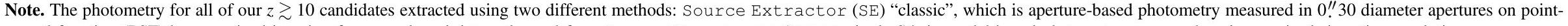 Figure 3 shows three different derivations of the full redshift PDFs from for each source measured using EAzY assuming flat redshift priors. We compare our fiducial modelbased photometric constraints to aperture photometry. In all cases, the probability of a solution using the model-based photometry is for each source. The source with the highest probability at is COS-z12-3 with , likely caused by its comparatively red color; the rest of the sample has . We emphasize again that the SE++-modelbased and SE “classic” aperture-based photometry are independently measured: the first from images in their native resolution, and the second from PSF-homogenized images. Because the aperture photometry only includes measurements from five bands (HST F814W and the JWST NIRCam bands), its derived redshift PDFs are broader and generally show an increased probability for a low-redshift solution. This increased uncertainty in the redshift PDF can be attributed to the limited number of bands used to constrain the redshift. To demonstrate the importance of the ground-based photometry for the photometric redshifts, we construct a hybrid photometric catalog which marries the HST + JWST constraints of the aperture photometry to the model-derived ground-based observations. We note that for these candidates, the ground-based constraints are almost all modestly constraining nondetections (or a handful of low-S/N detections in