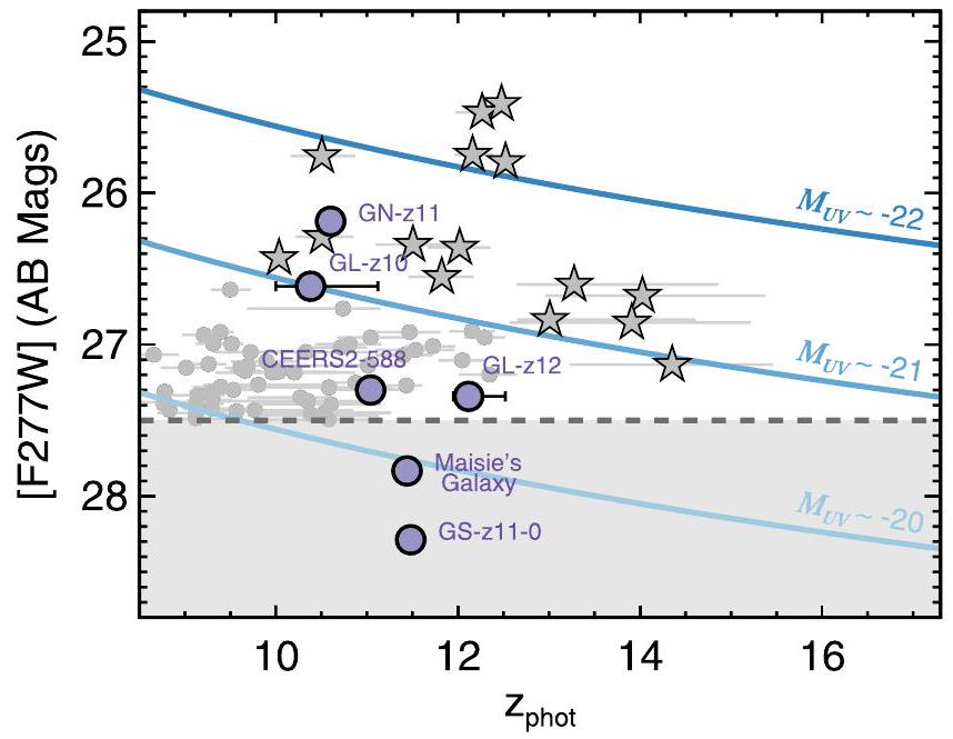 الشكل 1. توزيع المرشحين اللامعينالمجرات التي نحددها في البدايةمن COSMOS-Web (نقاط رمادية). المجرات الموصوفة في هذه الورقة (نجوم رمادية) مأخوذة من هذه العينة، مع التركيز على المجموعة اللامعة بشكل خاص (المجرات ذات التقديرات الأولية لـ ). لاحظ أن التحويل من [F277W] إلى كما هو موضح، فإن القيم المرسومة تقريبية فقط، حيث تعتمد التحويلات الدقيقة على ميل الأشعة فوق البنفسجية في إطار الراحة. المنطقة الرمادية تحدد مساحة المعلمات التي لم يتم استكشافها في هذا العمل ([F277W] > 27.5). المصادر الأدبية المعروفة موضحة باللون الأرجواني عند انزياحاتها الطيفية المقاسة. تم إعطاء انزياحات GL-z10 و GL-z12 وفقًا لاكتشافاتها الهامشية لـ [O III] من ALMA (باكس وآخرون 2023؛ يون وآخرون 2023) وعدم اليقين الفوتومتري الخاص بها (كاستيلانو وآخرون 2022).