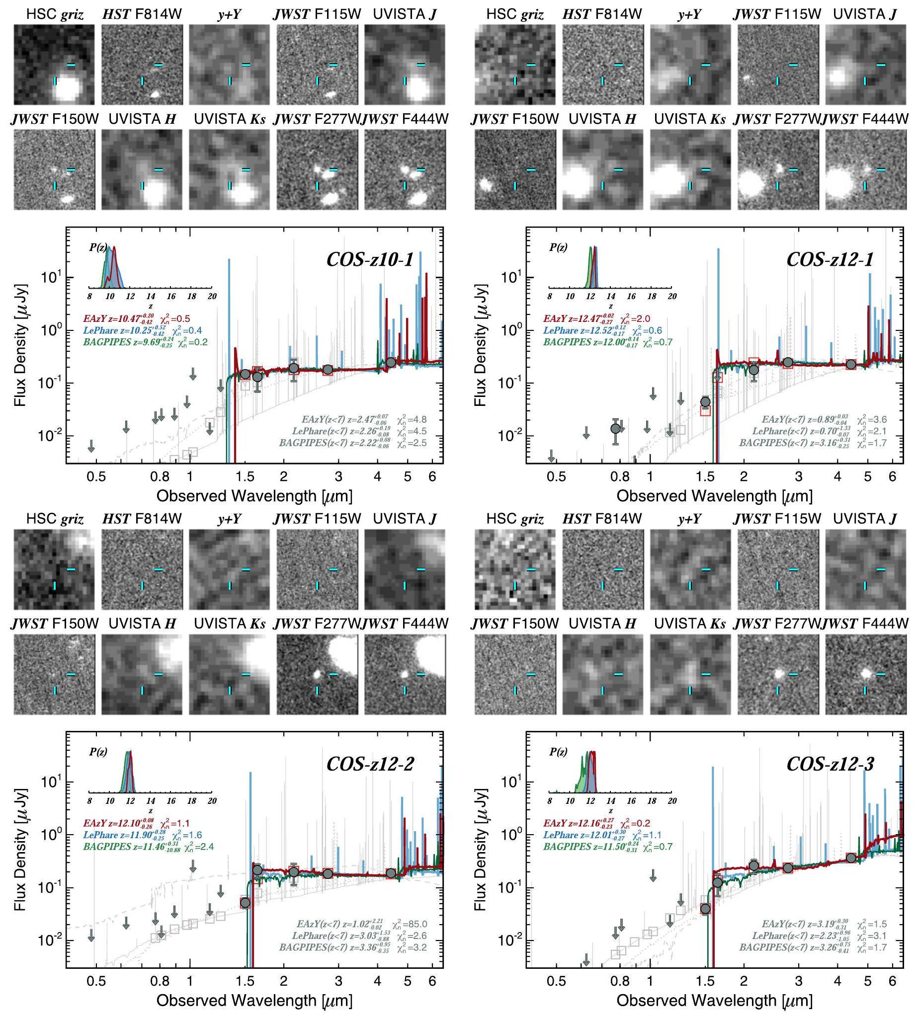 COS-z10-3 is detected in three NIRCam bands. COS-z10-3 has a close neighbor to the southeast that has a photometric redshift of that is also found in COSMOS2020 with a similar photometric redshift. We note that this is somewhat consistent with one of the three lowredshift solutions for COS-z10-3 found by EAzY of , which raises the probability this is a low-redshift interloper. However, we note that such a solution is a relatively poor fit compared to its corresponding high-redshift solution ( ), sufficiently high to remain in the sample.