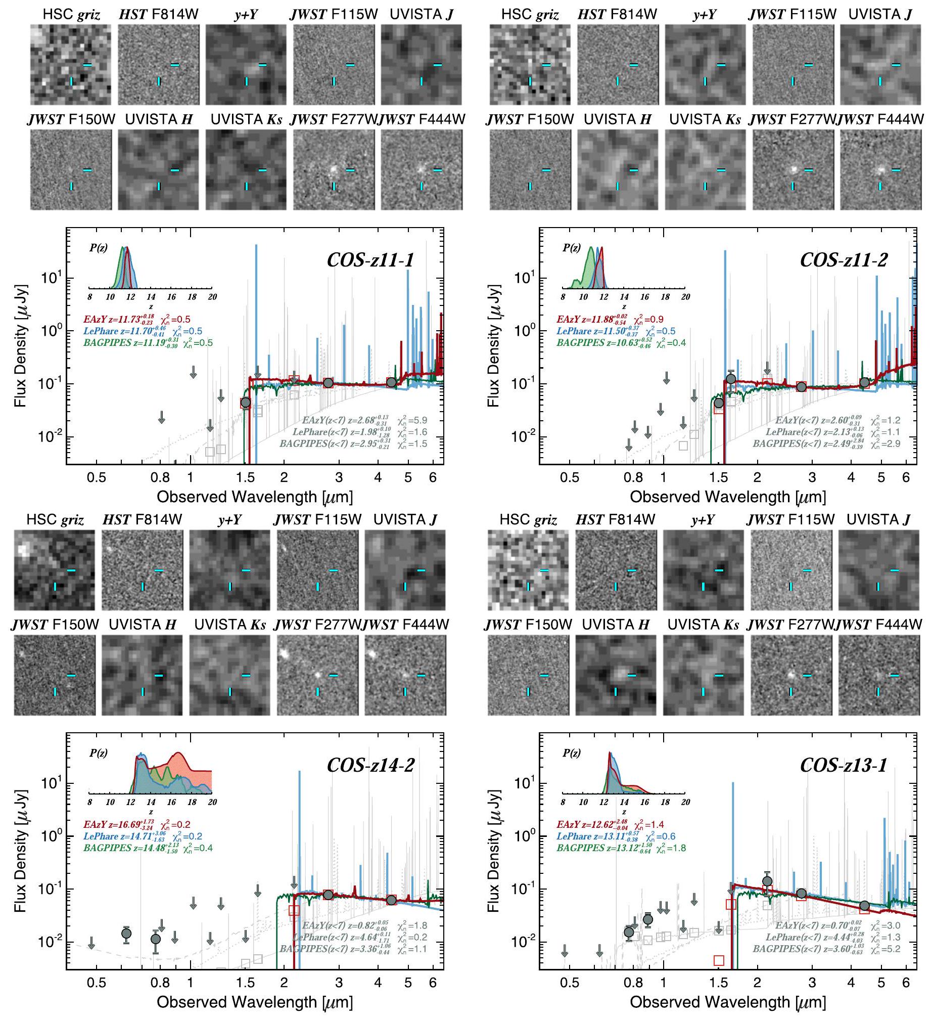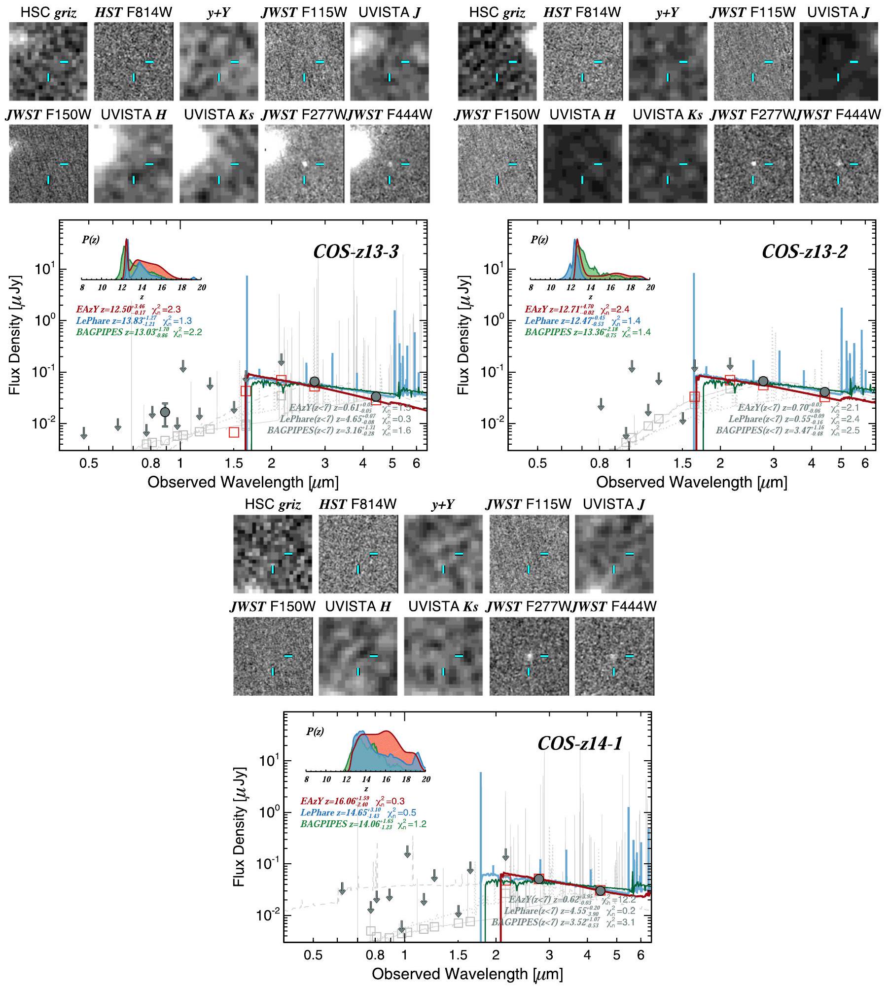 لشفافية في اختيارنا، يوضح الشكل 2 جميع الـ 15مرشحين مععلى الرغم من أن بعضهم لديهم حلول منخفضة الانزياح الأحمر قابلة للتطبيق كما تم قياسها عبر. يشمل ذلك COS-z12-4، الذي لدينا أسباب متعددة للاعتقاد بأنه في حالة منخفضة (موضح في القسم 4)، بالإضافة إلى COS-z13-3 و COS-z14-2، اللذان يتم اكتشافهما فقط في F277W و