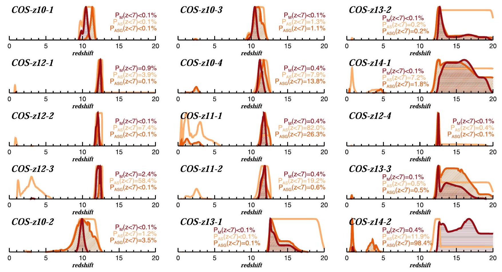 UltraVISTA). As a result, this hybrid catalog can be thought of as a sanity check on our model-based photometry, as we have replaced the most constraining, high- bands (i.e., JWST NIRCam) with aperture-photometry measurements. In all but two cases, COS-z10-4 and COS-z14-2, those additional ground-based constraints significantly reduce the probability of a viable low- solution over the space-based-only PDFs. COS-z10-4 is kept in the sample given that it formally passes our criteria for inclusion and COS-z14-2 is removed as previously discussed in Section 4.3.