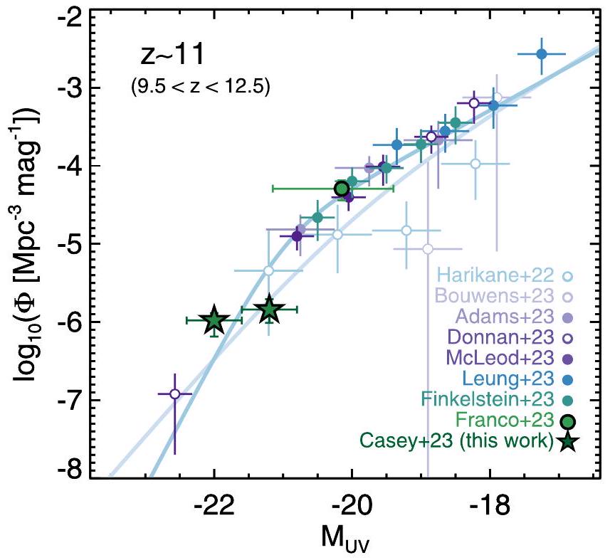 الآن بعد أن بدأ JWST في اكتشاف مجرات جديدة تتجاوز بالعشرات (إن لم يكن بالمئات؛ Adams et al. 2023a, 2023b; Finkelstein et al. 2023a; Franco et al. 2023; Harikane et al. 2023)، يمكننا تقييم ما إذا كانت GN-z11 فريدة من نوعها (Mason et al. 2023). غطت معظم الاكتشافات الجديدة سطوعًا داخليًا أضعف بكثير مع بيانات NIRCam العميقة التي تم الحصول عليها عبر مجالات رؤية ضيقة إلى حد ما ( )، لكن مسح COSMOS-Web (GO#1727؛ Casey et al. 2023) مناسب بشكل فريد لاكتشاف مصادر ساطعة ونادرة في