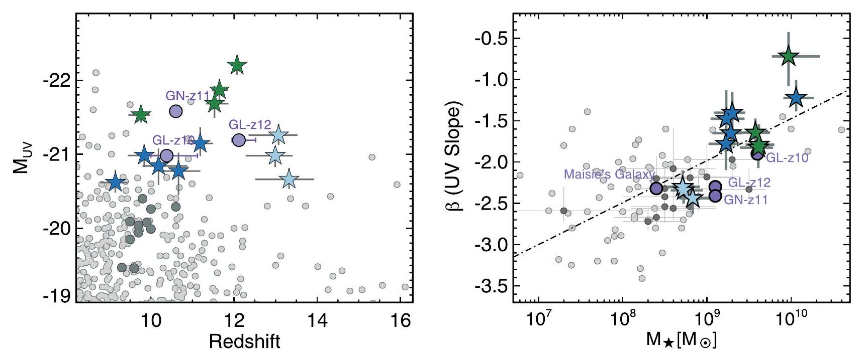 Figure 5. The derived physical characteristics of our luminous candidates relative to other samples of early Universe galaxies in the literature (gray points, the majority of which are from the JADES sample in the left panel; Hainline et al. 2024), explicitly highlighting the COSMOS-Web sample found by Franco et al. (2023) in dark gray. The four galaxies that are exceptionally luminous are shown as green stars, the bright sample is shown as dark blue stars, and the sample is shown as light blue stars; this color scheme persists in Figures 6, 7, and 9. Left: the rest-frame absolute UV magnitude against redshift in comparison to the literature samples. We highlight three other luminous sources: GN-z11 (now spectroscopically confirmed at ; Oesch et al. 2016; Bunker et al. 2023), GL-z10, and GL-z12 (Naidu et al. 2022b; Castellano et al. 2022) with tentative spectroscopic identifications from ALMA (Bakx et al. 2023; Yoon et al. 2023). Right: the rest-frame UV slope with stellar mass. Our sample is the reddest subset of candidates reported in the literature (Finkelstein et al. 2012; Tacchella et al. 2022; Topping et al. 2023). The dotted-dashed line is the best-fit relation derived for galaxies from Finkelstein et al. (2012). No trend is detected in vs. (see Topping et al. 2023).