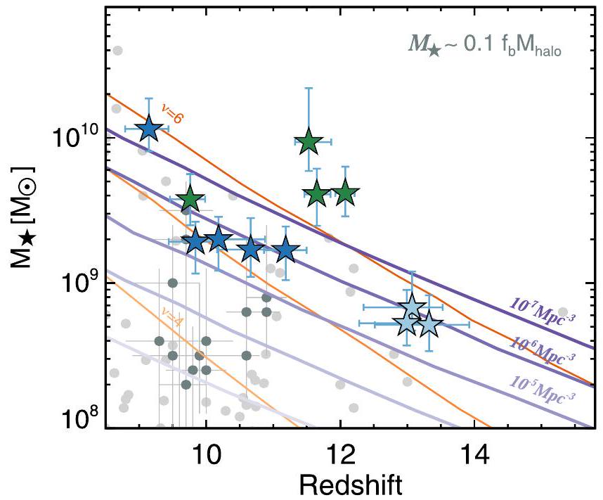 In stellar mass space, a subset of our sample pushes the bounds of the most massive sources that could plausibly be found in deep JWST surveys at ; in particular, COS-z121, COS-z12-2, and COS-z12-3, with masses at . We overplot curves of constant number density in Figure 7 implied from the halo mass function (Sheth & Tormen 1999) scaled by the cosmic baryon fraction and a reasonable “efficiency” of , where represents the fraction of baryons that have been converted into stars within a halo over its integrated lifetime, . We note that the typical peak of the stellar mass-to-halo mass relation (SMHR) is across a range of redshifts (Mandelbaum et al. 2006; Shankar et al. 2006; Conroy & Wechsler 2009; Behroozi et al. 2010, 2019; Shuntov et al. 2022), implying a maximum (and one might expect this fraction to be lower at much earlier cosmic times where constraints on the SMHR do not yet exist). We also overplot