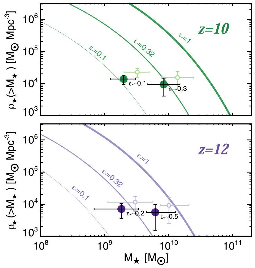 In Figure 8, we directly calculate the cumulative stellar mass density in two bins centered at and with width . We use the full posterior distributions in and as derived using Bagpipes for these calculations and assume Poisson uncertainties. Direct comparison to the halo mass function implies reasonable to high stellar baryon fractions with at , not too distinct from expectations from the SMHR (Behroozi et al. 2019). However, at , our discoveries imply higher stellar mass fractions, with (see also the forthcoming publications by K . Chworowsky et al. 2024, in preparation; M. Shuntov et al. 2024, in preparation). Harikane et al. (2023) present a comprehensive overview of early Universe discoveries from JWST in its first year, and they find that particularly bright galaxies ( ) found in deeper, smaller volume surveys require high efficiencies, where 0.3 , to produce stellar masses at . Such candidates were not expected before JWST. Are such high stellar baryon fractions of realistic?