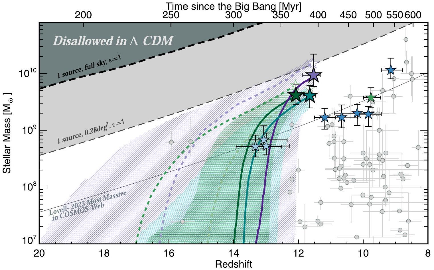 Figure 9. Stellar mass against redshift for the candidates identified in this paper (stars). Here we highlight the integrated SFHs for the three most massive candidates, which incorporate a delayed- plus recent starbursts: COS-z12-1 (dark green), COS-z12-2 (teal), and COS-z12-3 (purple). The dashed lines show stellar mass growth histories if the SFH is instead assumed to be delayed- only without a burst; this results in higher stellar masses that would have built up more mass early . With the delayed- plus burst model, the stellar masses may have increased by an order of magnitude in less than 100 Myr , from progenitors that look much like the candidates we identify in Section 4.3. Other high- candidate galaxies from the literature are shown in gray points. Stellar masses that are formally disallowed in CDM are noted in dark gray, corresponding to the stellar mass threshold for the most massive halo in the full sky assuming . We also show the same threshold corresponding to , the area covered by COSMOS-Web in this work. Similarly, the most massive galaxy anticipated in all of COSMOS-Web, calculated by Lovell et al. (2023), is shown in the thin gray line; it assumes the halo baryon-to-stellar conversion efficiency varies, with average , and the confidence intervals about that mass threshold encompass the most massive galaxy (COS-z12-3) within .