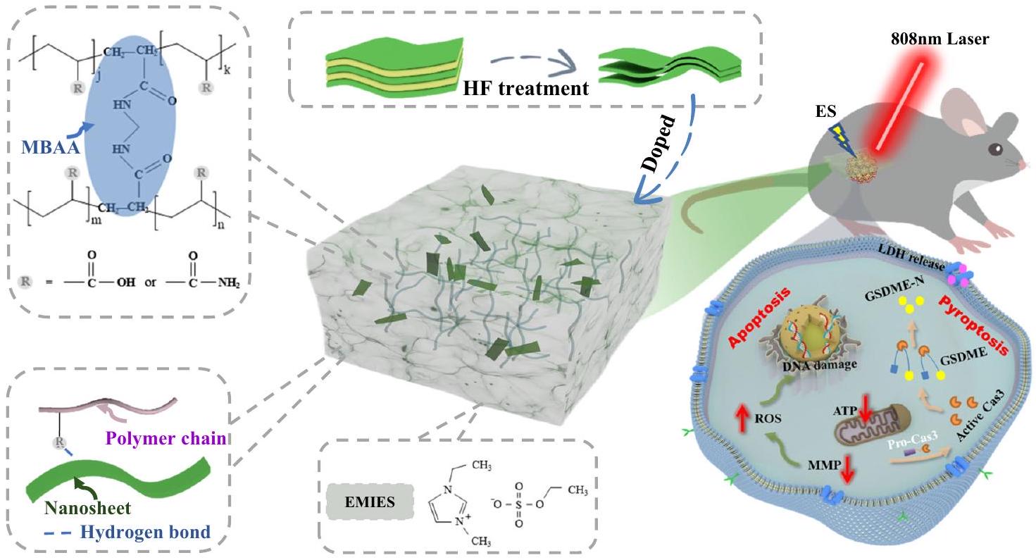 MXene, as a class of versatile two-dimensional (2D) layered materials, has become the research hotspot due to superior features such as simple preparation, good electroconductivity, photothermal properties and so on . Doping ionic gel with MXene would be a good excellentution to obtain patches with improved photothermal properties and could further enhance tensile property as well as electrical conductivity, which would be a promising platform to trigger ES and photothermal treatment (PTT) for tumor treatment during photoelectric co-stimulation. Importantly, ES is an effective physical modulator of cellular activity with the advantages of little damage, low induction of immune response, and repeatable operation . Compared to other mechanical or chemical stimulations, ES has been proven an excellent technique to regulate cell migration , proliferation , differentiation , and death for applications in wound healing , neurological recovery and especially cancer therapy . And ES induces mitochondrial dysfunction, which ultimately leads to oxygen radical storm production, which leads to disruption of cellular redox homeostasis and DNA damage, ultimately leading to cell death . ES with patches can achieve full coverage of the entire tumor, avoiding the risk of tumor cells escaping during treatment . Therefore, the combined use of ES with other therapeutic methods, such as PTT, which has been extensively developed for tumor treatment due to its low invasiveness and minimal tissue damage , would be promising for achieving highefficacy tumor treatment. The PTT relies on photosensitizers to absorb incident light and convert the absorbed photon energy into heat, resulting in a rapid increase of local cell temperature over a certain period of time and the destruction of tumors at high temperatures . However, traditional photothermal materials, which are mainly made of metal nanomaterials, are often difficult to make close contact with the skin, and the condition of the skin beneath the materials with poor transparency cannot be visually detected in real-time during treatment, which may lead to overheating to skin burns.