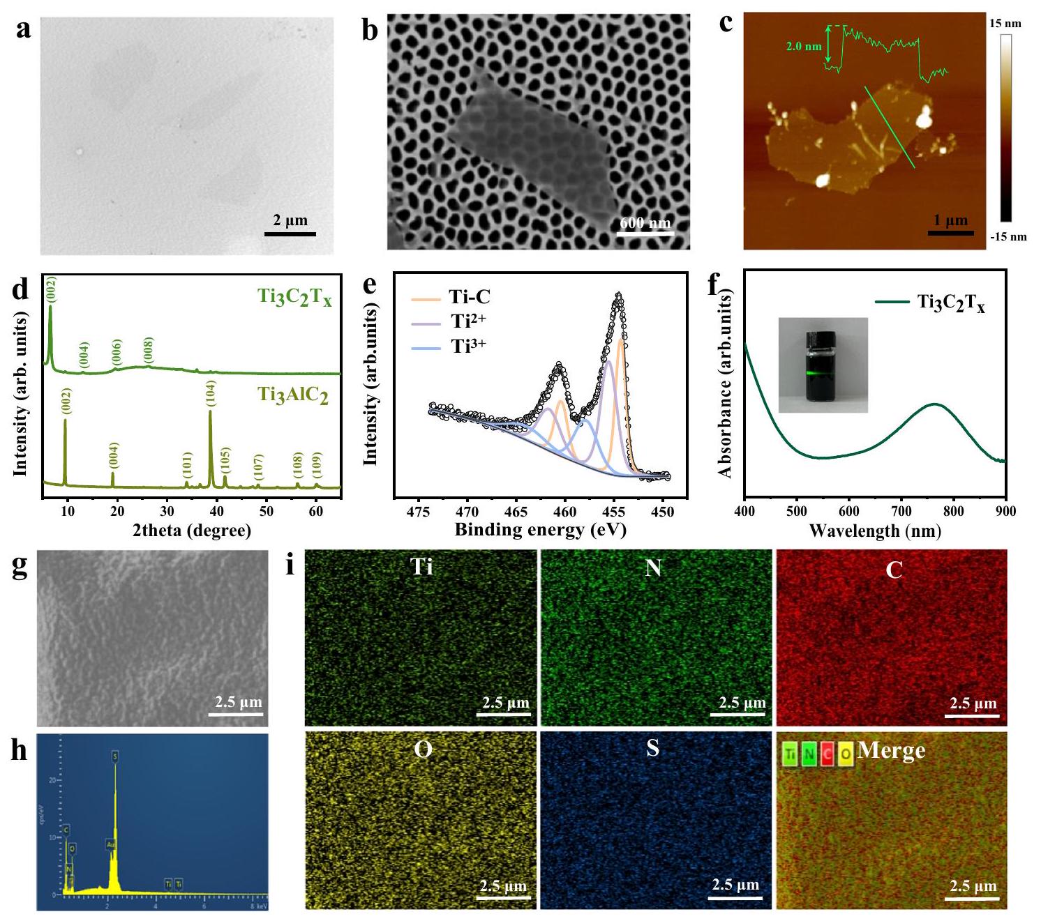 أولاً، طبقات النانو من MXeneتم الحصول عليها عن طريق النقشمسحوق (ماكس) في محلول مختلط من فلوريد الليثيوم وحمض الهيدروكلوريك، ثم تم الطرد المركزي وتفريقه في الماء للحصول على طبقات نانوية منالمستحلبات، وبعد التجفيف بالتجميد للحصول على مسحوق MXene. كما هو موضح في الشكل 2a و b، تم ملاحظة الهيكل الطبقي ثنائي الأبعاد فائق النحافة للعينة بوضوح من خلال المجهر الإلكتروني الماسح (SEM)، وكذلك تصوير المجهر الإلكتروني الناقل (TEM) باستخدام الألومينا الأنودية ذات المسام النانوية كدعم، مما يدل على التحضير الناجح للمواد الكيميائية المستخرجة.الأغشية النانوية. سمك الـتبلغ سماكة النانوصفائح المقاسة بواسطة المجهر الذري القوي حوالي 2 نانومتر، كما هو موضح في الشكل 2c، وهو ما يتوافق مع العمل المبلغ عنه سابقًا.. بعد ذلك، هيكل البلورة لـتم قياس النانوصفائح باستخدام حيود الأشعة السينية (XRD). كما هو موضح، نمط حيود الأشعة السينية لمسحوق MAX معفي الشكل 2d، انزاح ذروة (002) بشكل واضح منإلى زاوية أصغر منوتم اختفاء القمم الثلاثة المخصصة لـ (101) و(104) و(105) المرتبطة بـ MAX، بسبب التحول منمنلتحقيق التداخل، وإدخال إلى السطح من ومجموعات النهاية -F للحصول على مزيد من المعلومات حول المجموعات السطحية لـالأغشية النانوية، تم اكتشافها بواسطة مطياف الأشعة السينية للالكترونات (XPS). يظهر طيف XPS للأغشية النانوية قممًا نموذجية لـ، ، ، و F1s من 0 إلى 1000 إلكترون فولت (الشكل التوضيحي 1)، وكانت القمم الموجودة عند، و976 إلكترون فولت، على التوالي. وأكدت النتيجة أن سطح الأوراق النانوية المحضرة يحتوي على