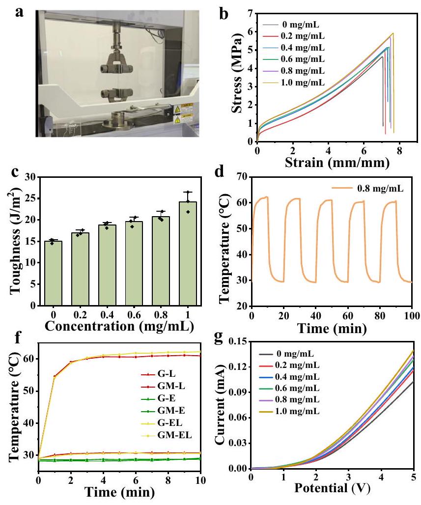 لإثبات أن اللصقة الأيونية المطورة هنا تمتلك مزايا واضحة على لصقة الهيدروجيل، تم تحضير هيدروجيل بولي (أكريلاميد-كواكريليك) المدعوم بـ MXene كعنصر تحكم، وتم فحص الاستقرار الحراري، والتوصيل الكهربائي، وخصائص الشد لللاصقات الهيدروجيل. كما هو موضح في الشكل S13، أظهرت النتائج بوضوح الاستقرار الحراري الضعيف للدورة لللصقة الهيدروجيل مقارنة باللصقة eT (الشكل التكميلي 13a والشكل 3d)، كما يتضح من ارتفاع درجة الحرارة غير القابل للتحكم لللاصقات الهيدروجيل المدعومة بـ MXene تحت إشعاع الليزر المتقطع. كما أظهرت لصقات الجل الأيوني أيضًا توصيلًا كهربائيًا أفضل وقوة كسر أعلى وامتداد أكبر من لصقات الهيدروجيل (الأشكال التكملية 13b، c).