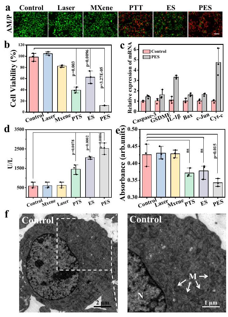 Fig. 4 | Mechanism study of PES for inducing cell death. a Live/dead staining fluorescence images of B16F10 cells after the different treatments (Control, Laser, MXene, PTT, ES, and PES). The scale bar is . b Cell viability of B16F10 cells after the different treatments. values were calculated by two-tailed -tests. ( ). c, RT-PCR analyses of Caspase-3, GSDME, IL-1 , Bax, c-Jun, Cyt-c expression within B16F10 cells before and after the PES treatments . d The lactate dehydrogenase (LDH) release levels from B16F10 cells after the treatments under different conditions. values were calculated by two-tailed -tests. ( ). e ATP content change within B16F10 cells under the same cell number after different treatments tested using the ATP assay kit. values were calculated by two-tailed –